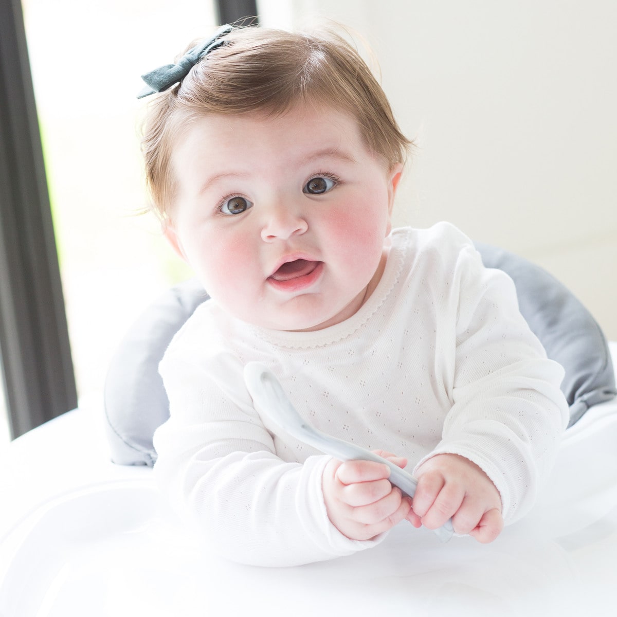 スプーンの先端は、赤ちゃんの1口サイズに合わせた浅めの形状です。しっかりと握れるように表面と裏面に凹みが付けられているので、スプーンデビューにもおすすめです。