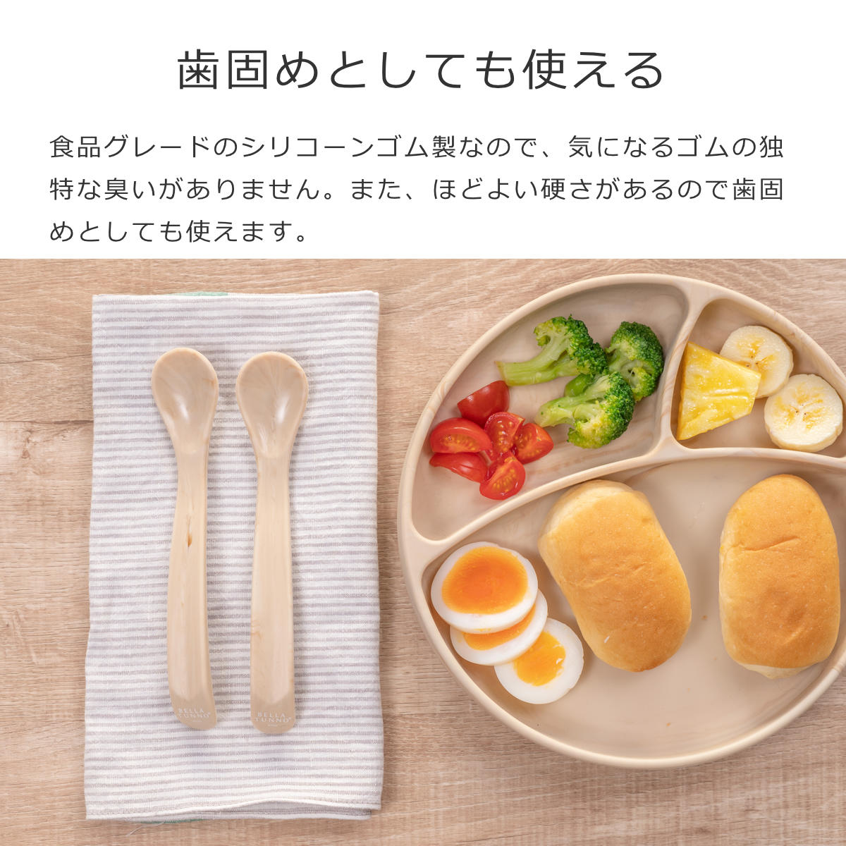 スプーン全体が柔らかい素材なので、万が一ポイッと投げてしまってもケガをする心配がなく、床に落としたりしても傷が付くこともありません。