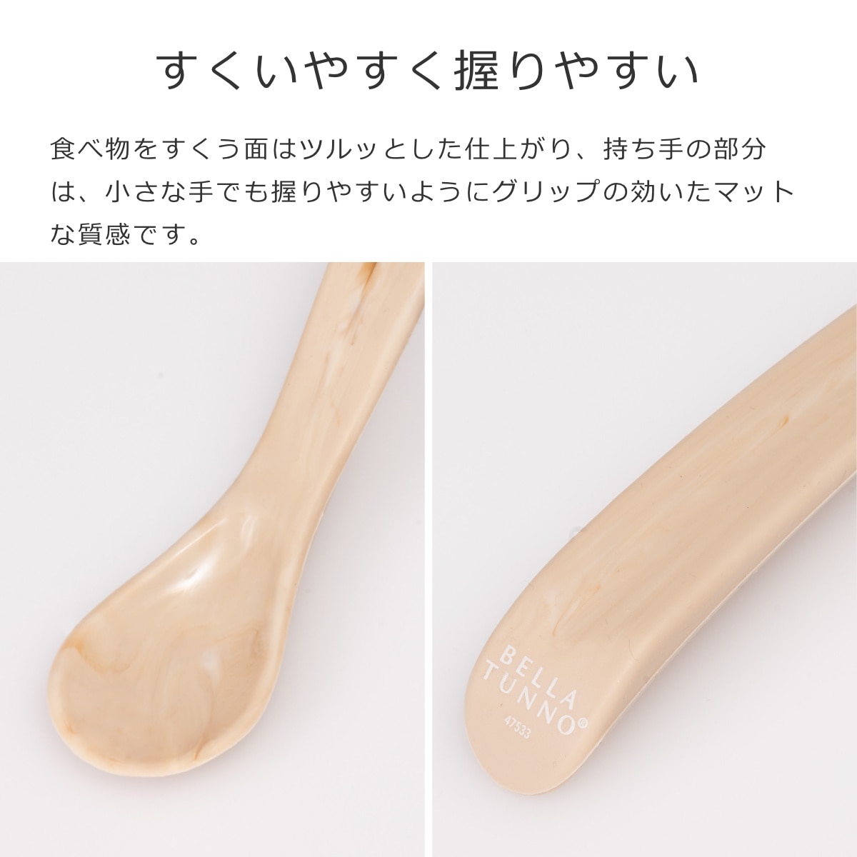 食べ物をすくう面はツルッとした仕上がり、持ち手の部分は、小さな手でも握りやすいようにグリップの効いたマットな質感です。