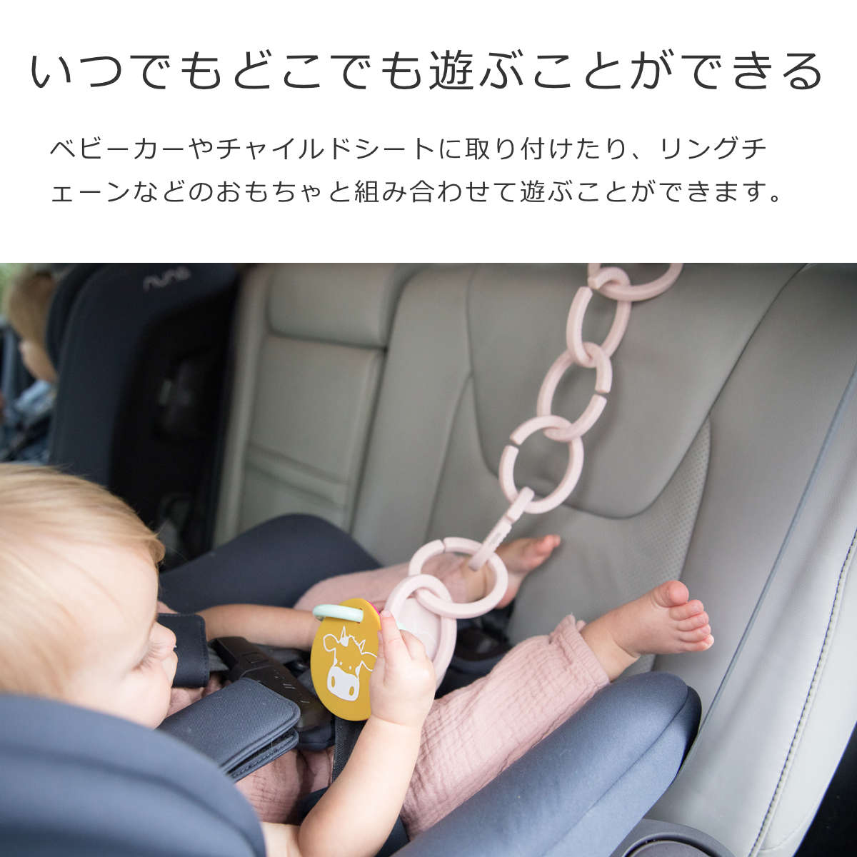 ベビーカーやチャイルドシートに取り付けたり、リングチェーンなどのおもちゃと組み合わせて、いつでもどこでも遊ぶことができます。