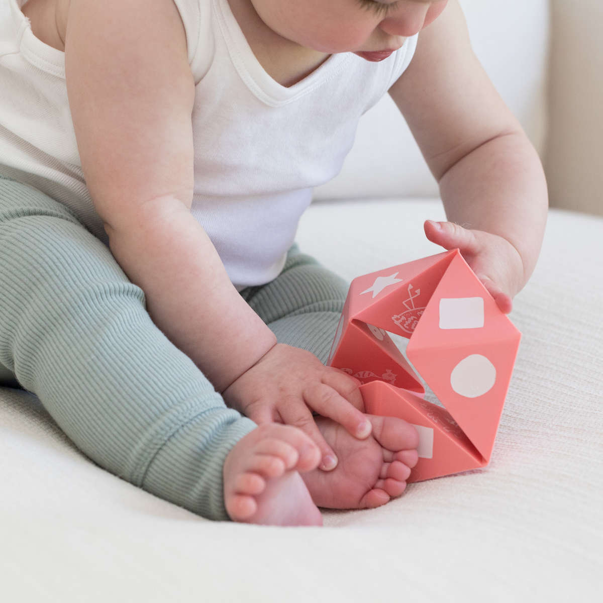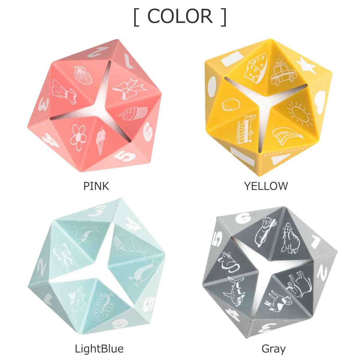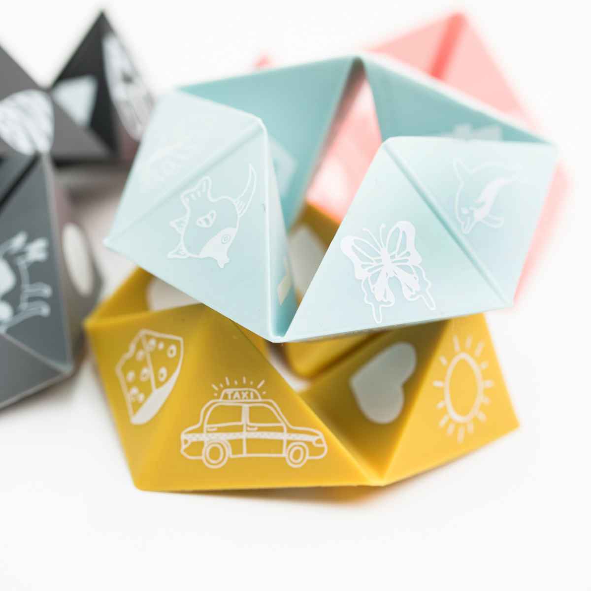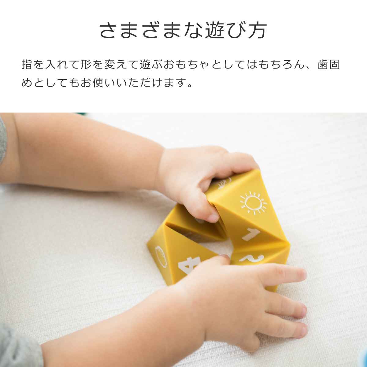 指を入れて形を変えて遊ぶおもちゃとしてはもちろん、歯固めとしてもお使いいただけます。子供たちにカタチや動物、乗り物、数字など、遊びながらさまざまなことを教えることができます。