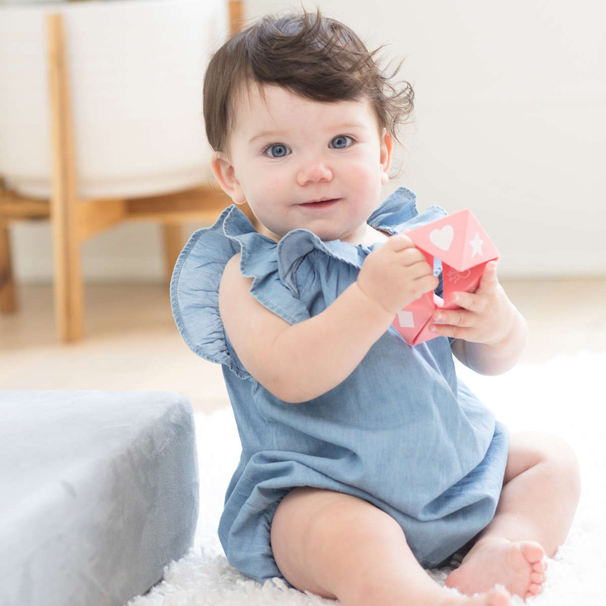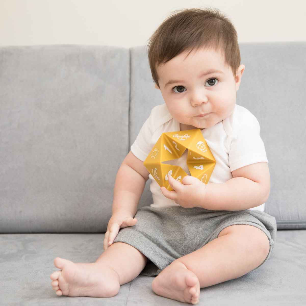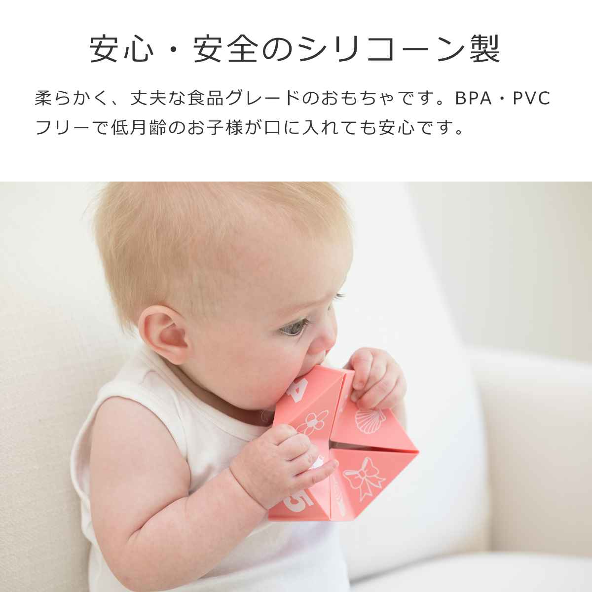 口に入れても安全、柔らかく、丈夫な食品グレードシリコーンゴムで作られたおもちゃです。BPAフリー、PVCフリーで低月齢のお子様が口に入れても安心です。