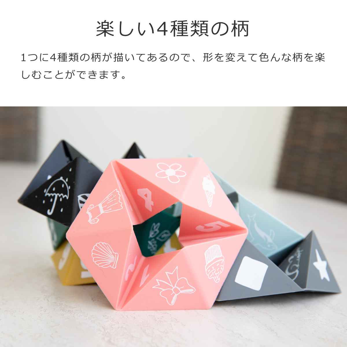 1つに4種類の柄が描いてあるので、形を変えて色んな柄を楽しむことができます。