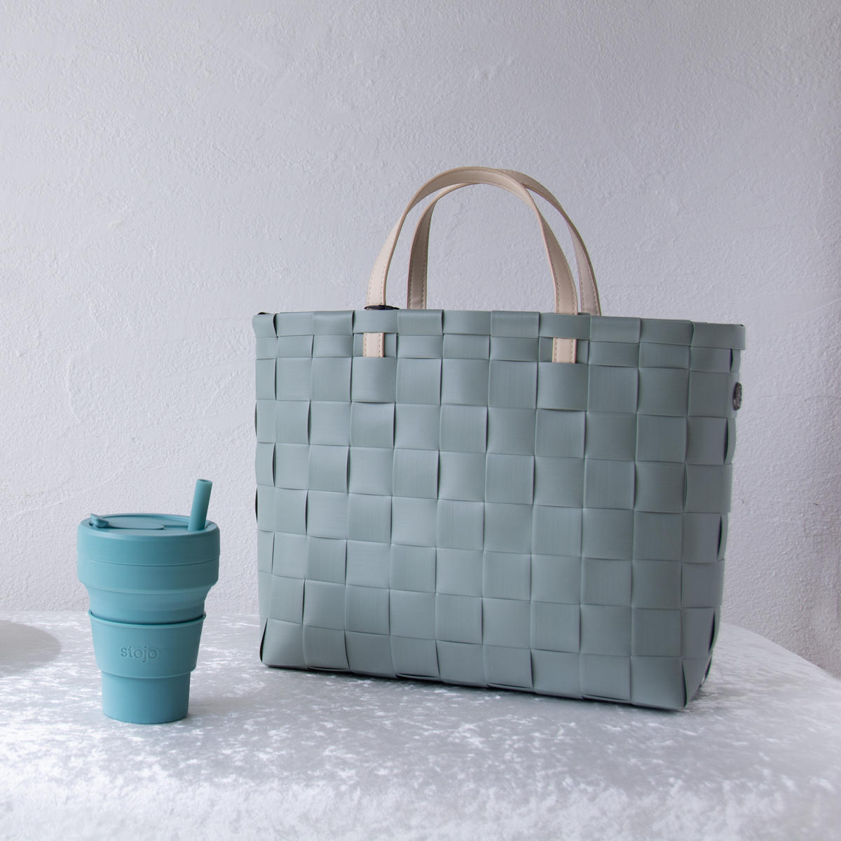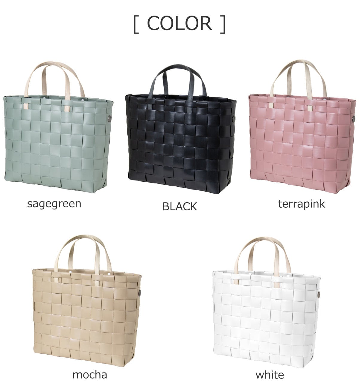 カラーはsagegreen、BLACK、terrapink、mocha、whiteの5色です。明るめの4色は持ち手の部分が本体と別の色に、BLACKは本体と同じ黒の持ち手が編み込まれています。お好みのスタイルに合ったカラーをお選びいただけます。