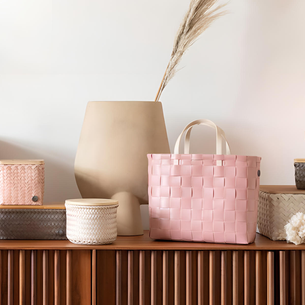 持ち手は本体に編み込まれていて倒れない仕様なので、急いでいる時でもパッと手に取れます。スムーズに持ち運べる便利なポイントです。