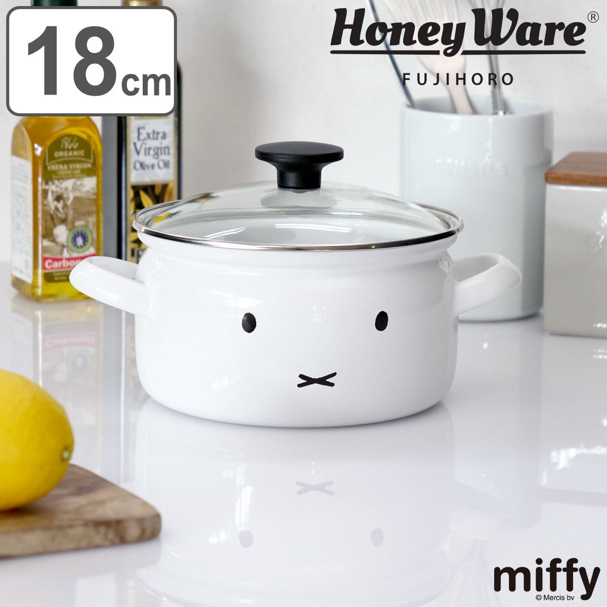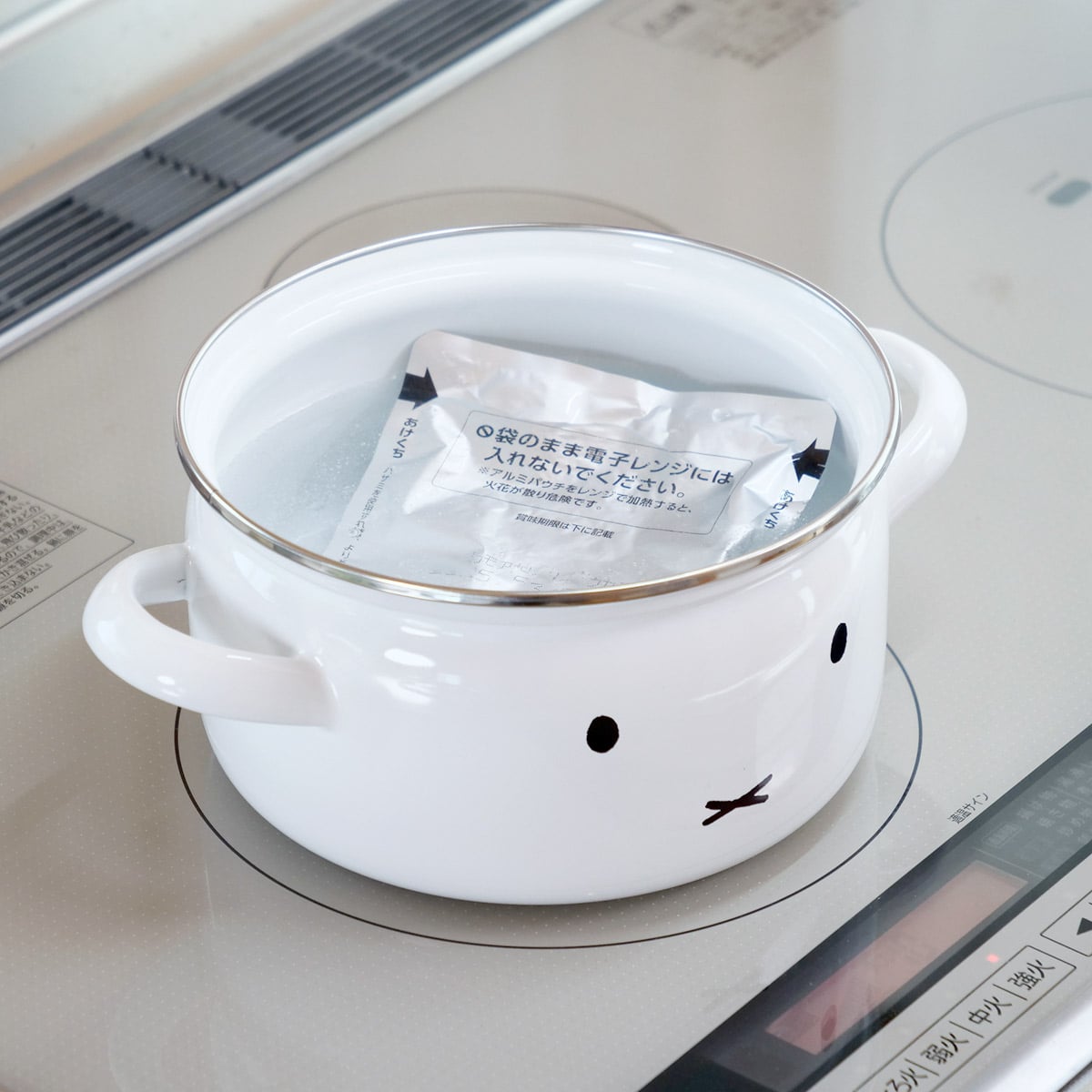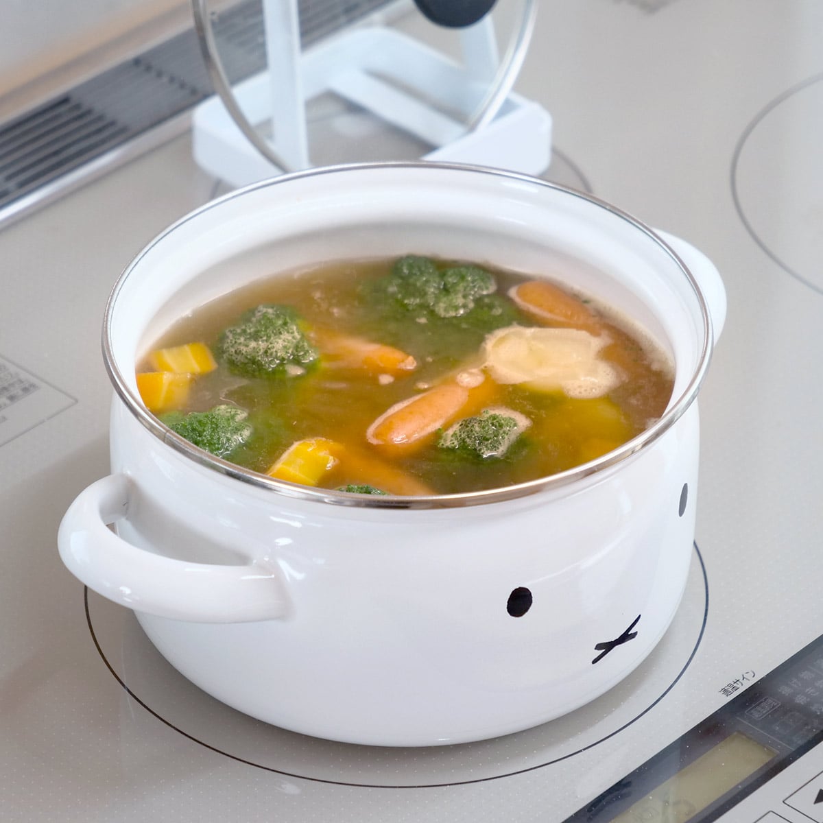 ミッフィーのかわいいおかおがデザインされた、ホーロー製の両手鍋です。2人分の煮物やスープ作りにちょうどいいコンパクトサイズです。じっくり、コトコトと長時間煮込む料理に使いやすく、ガス火でもIH調理器でも、熱効率よく調理できます。