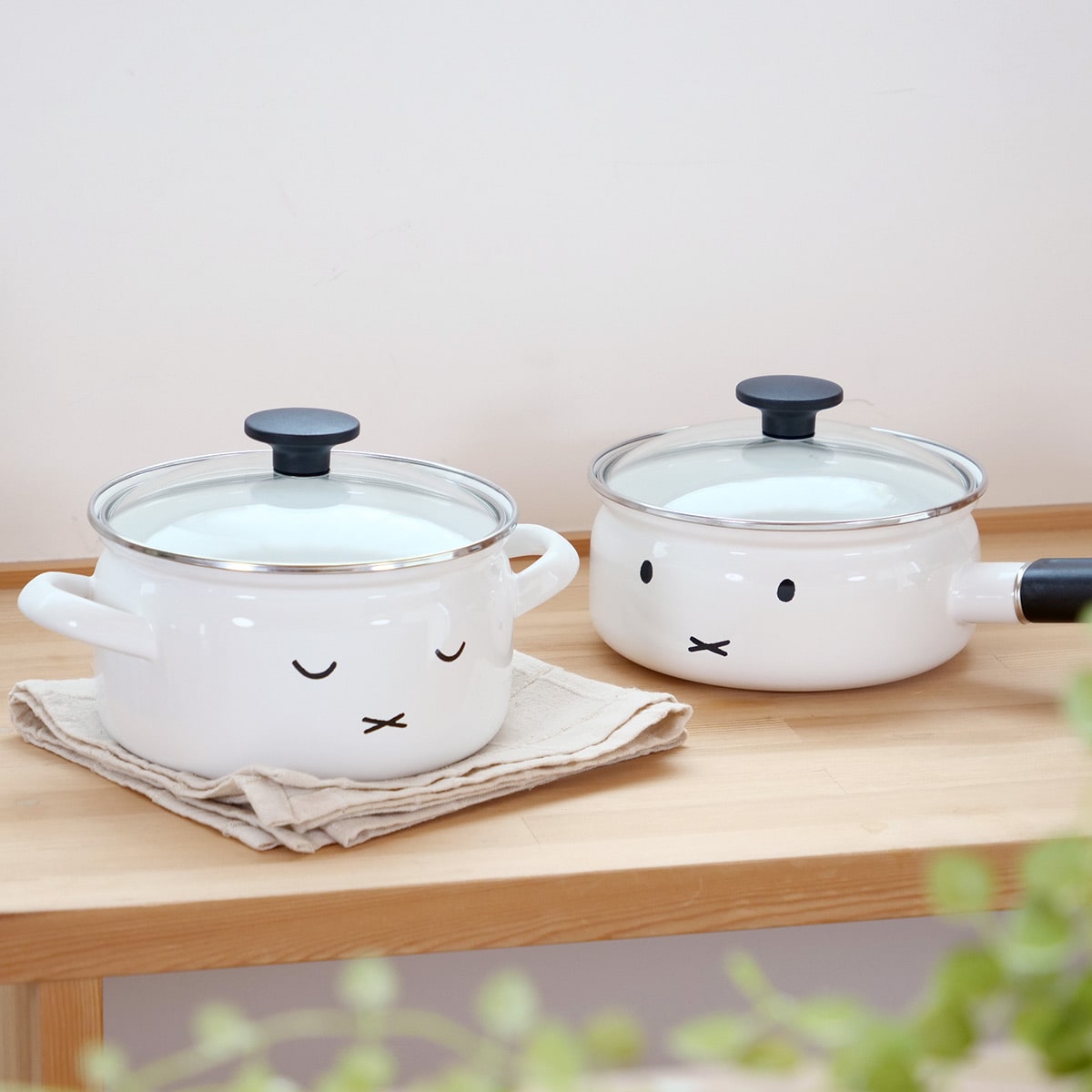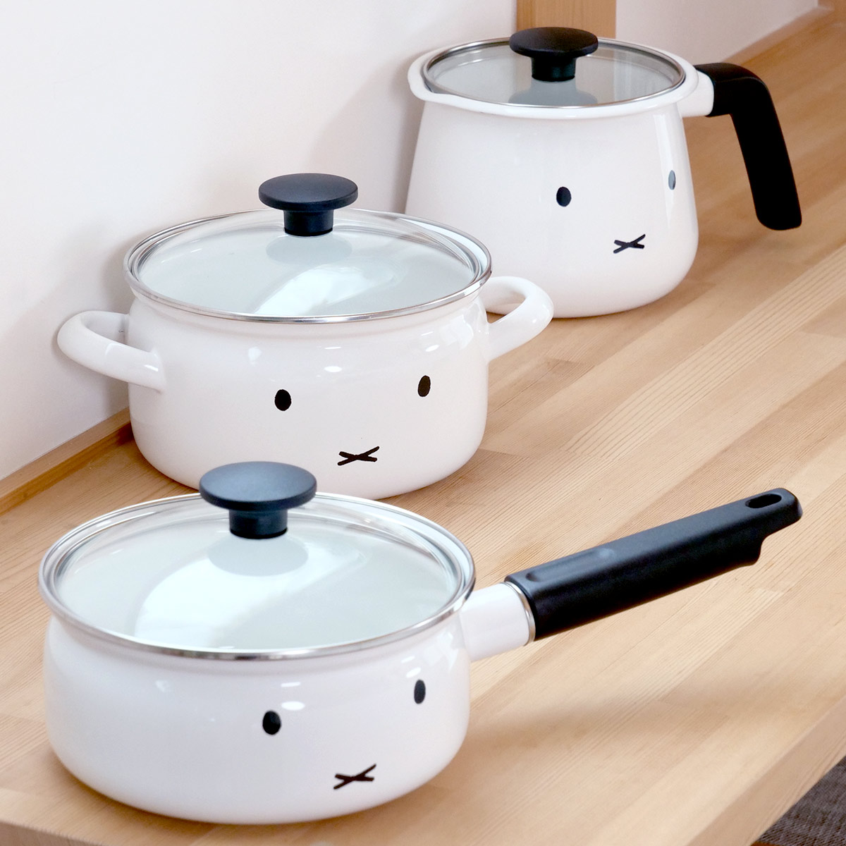 ミッフィーのかわいいおかおがデザインされた、純白のホーロー製キッチンウェア、ミッフィーフェイスシリーズ。保存容器や調理道具など、揃えることでキッチンに統一感がうまれ、おしゃれに整います。