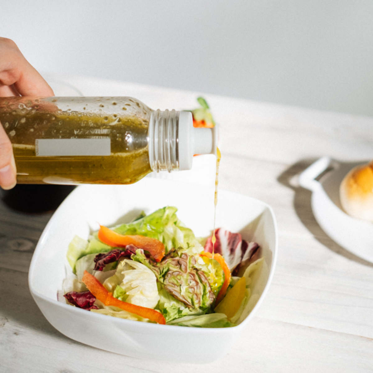 食卓にもそのまま出せる、シンプルなデザインのドレッシングボトルです。目盛り付きなので、計量スプーンやカップを使わずに調味料を入れることができ、シェイクするだけで簡単にドレッシングが作れます。スリムな形状なので、冷蔵庫のドアポケットにもすっぽり入り、そのまま保存もできます。