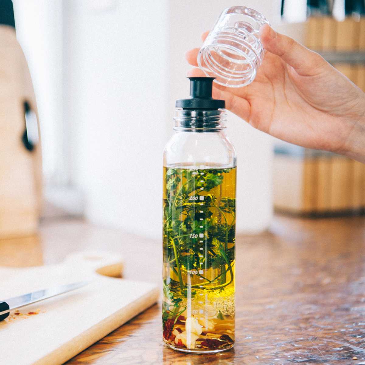 透明感のあるガラス製なので、手作りのハーブオイルやフレーバーオイルにもおすすめです。見た目も美しく、日々の暮らしに彩りを添えてくれます。