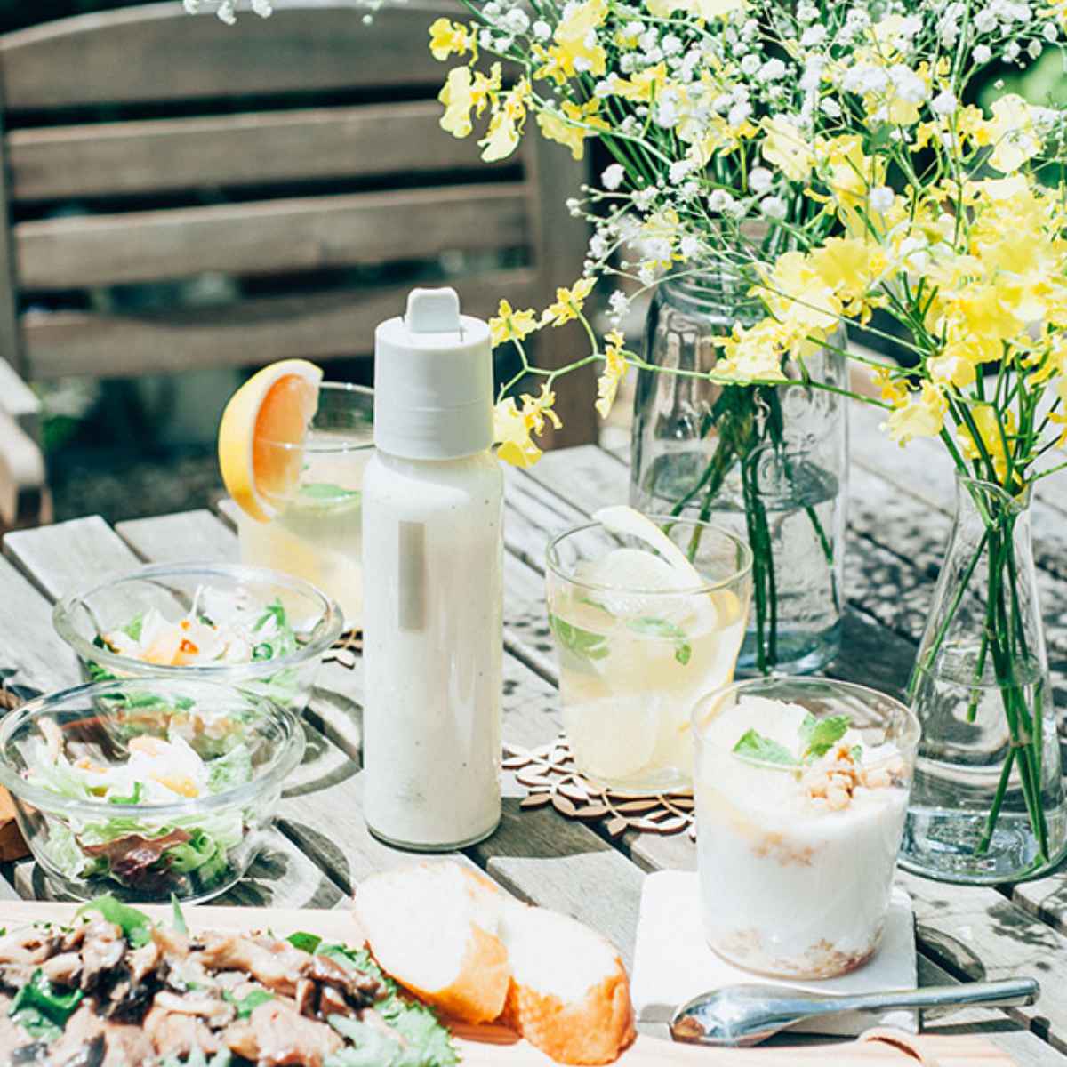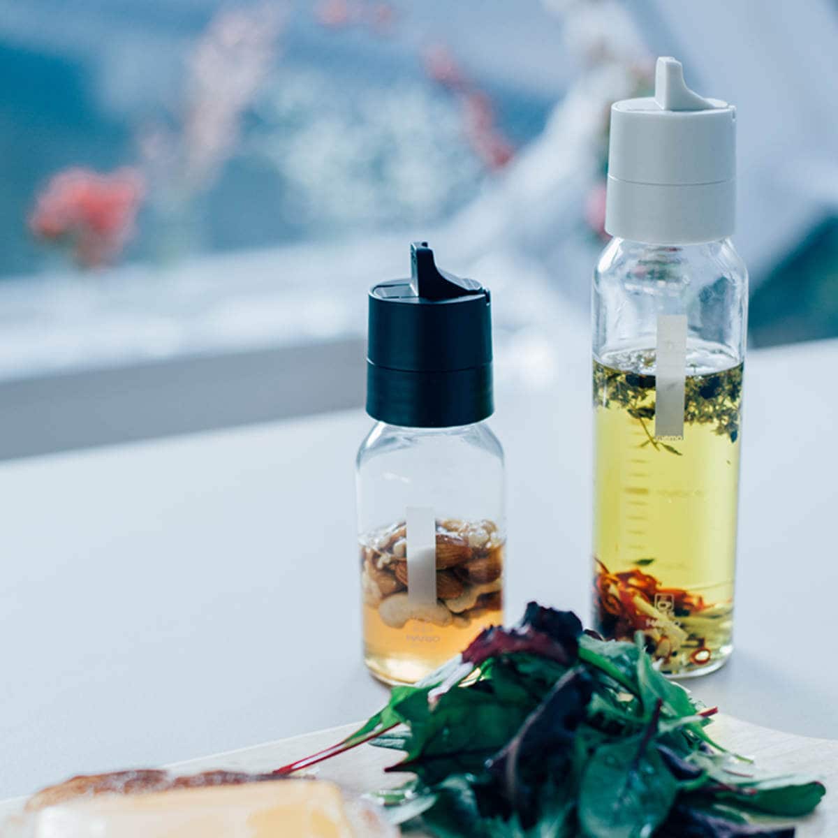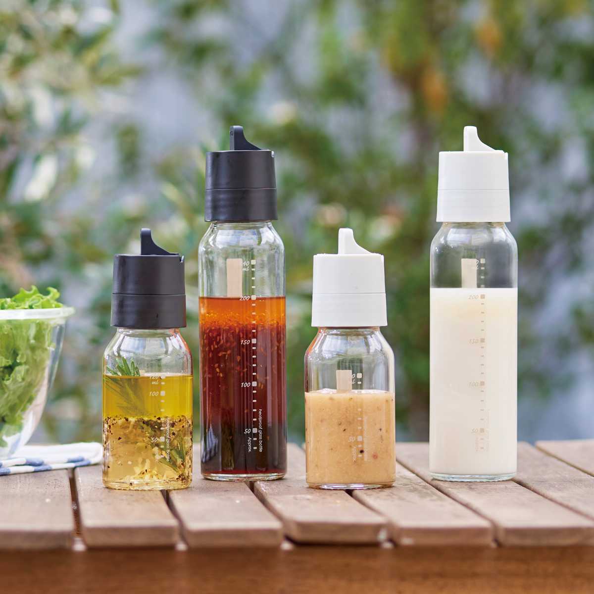 注ぎ口の開閉が、片手で簡単にできるドレッシングボトルです。食卓にもそのまま出せるシンプルなデザインなので、手作りドレッシング用としてだけでなく、市販のドレッシングを移し替えて使うのもおすすめです。
