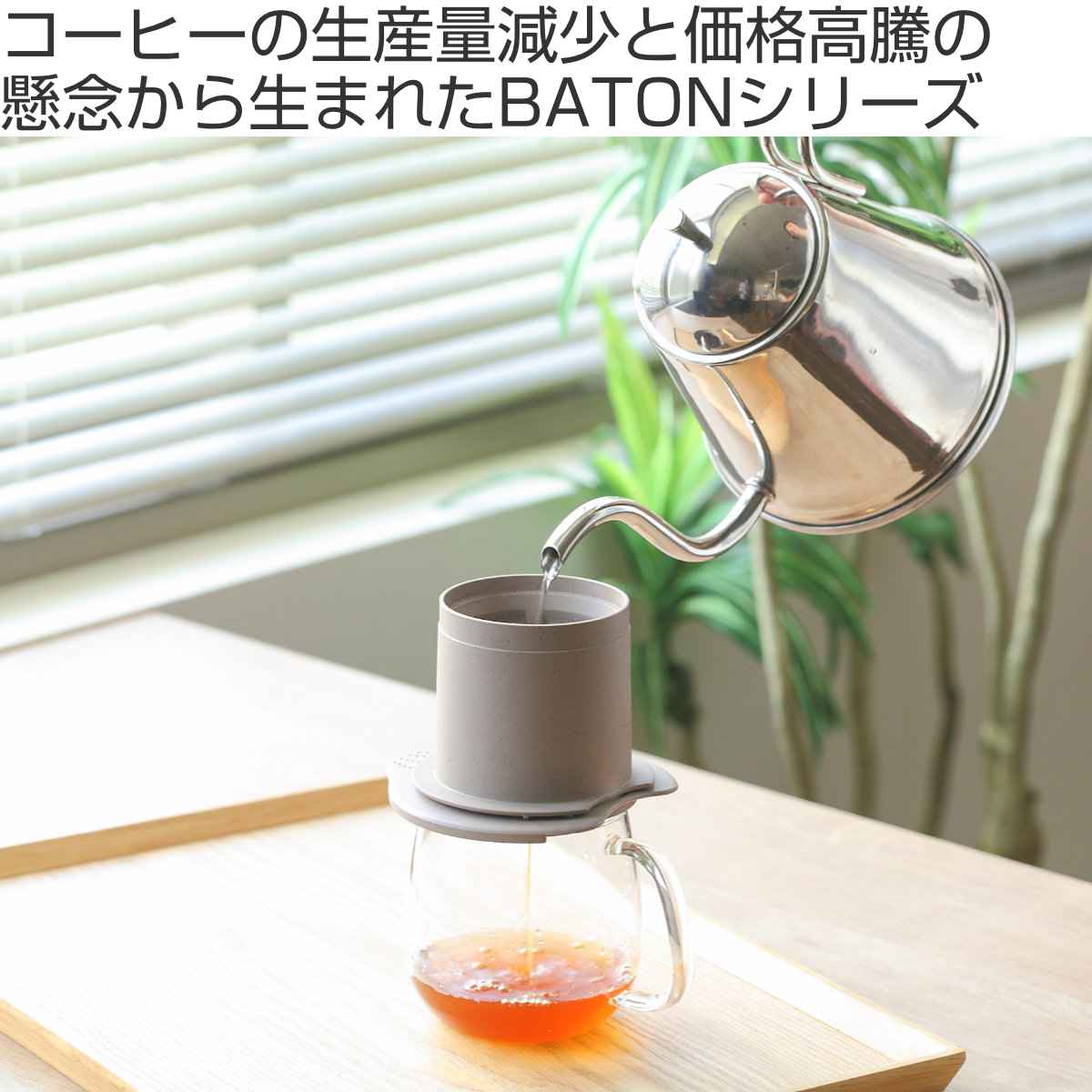 「BATON(バトン)」シリーズは、廃棄してしまう抽出後のコーヒー粉などの天然系素材を使用し、プラスチックの使用量を約50%削減しました。また、ペーパーを使わないドリッパーなど、環境に配慮した製品のシリーズです。はるか昔から繋がれてきたバトンを、これからもずっと、未来へ繋いでいきたいと願っています。