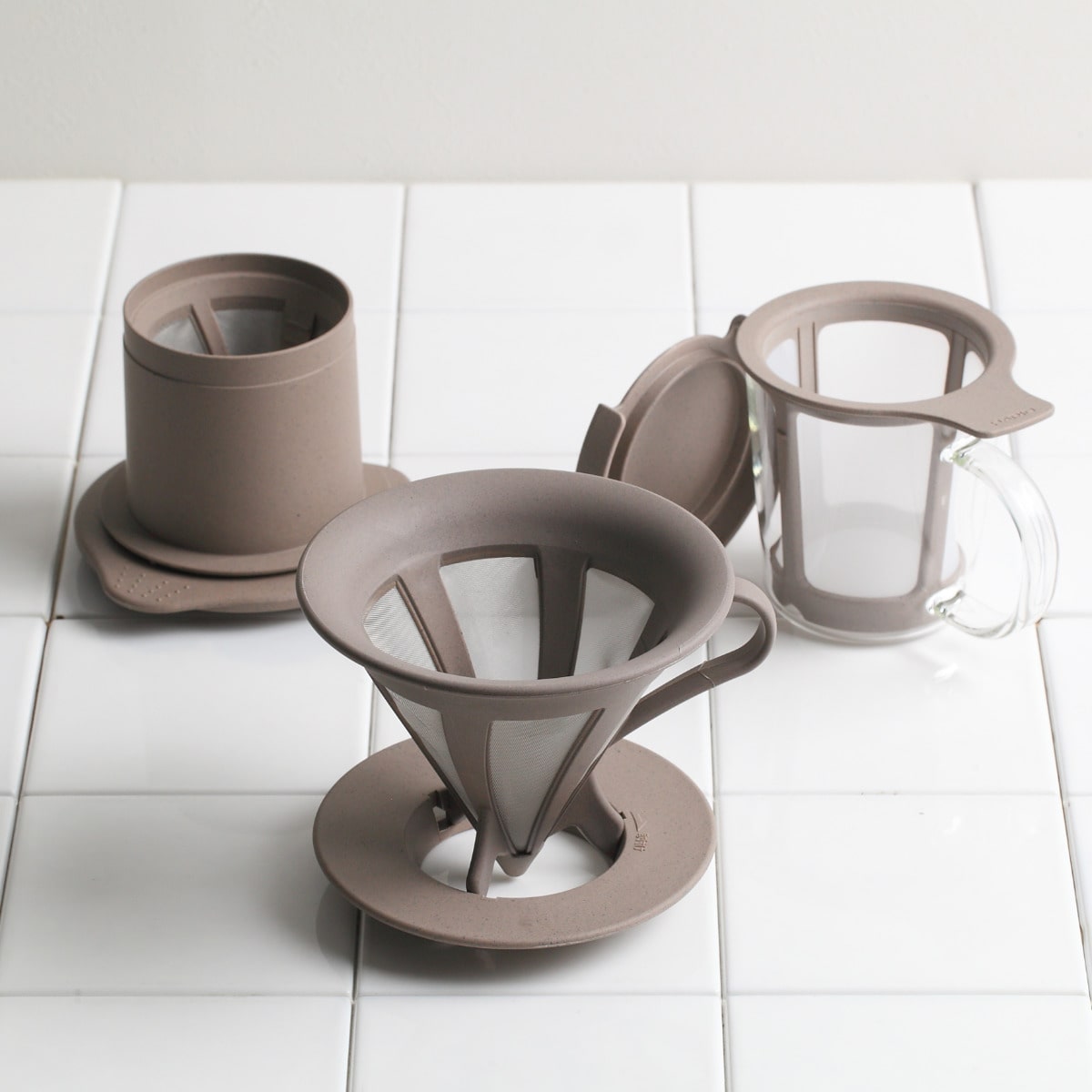 | 材質 | ドリッパー・フレーム・アタッチメント:ポリプロピレン、コーヒーカス、天然系無機物 ドリッパーメッシュ部:ステンレス |