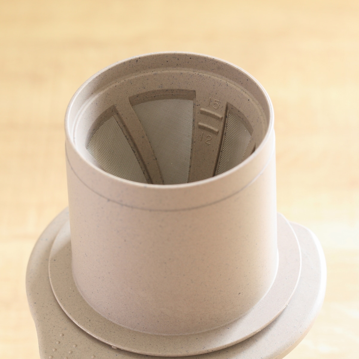 ・お手持ちのカップにアタッチメント、ドリッパーをセットし、コーヒー粉(中挽き)を下目盛りまで入れ、少しゆすって平らにします。