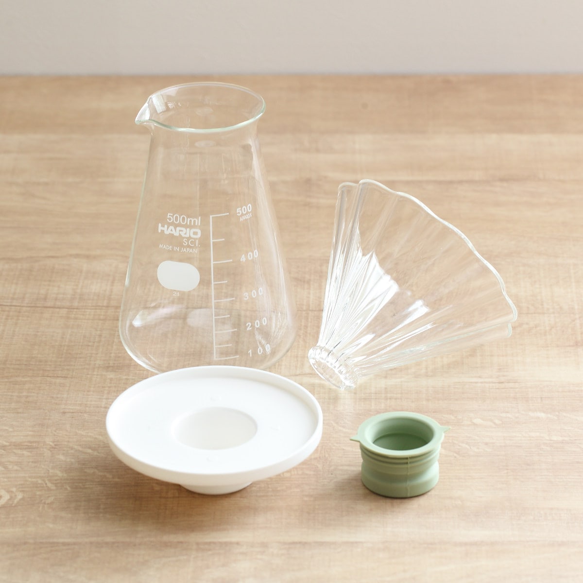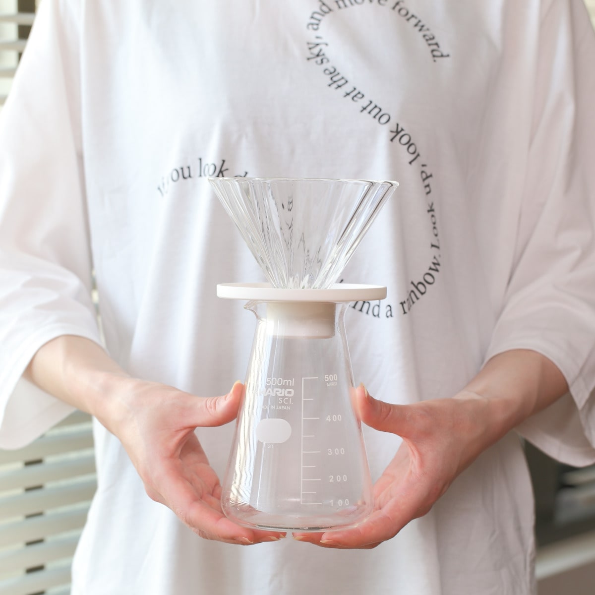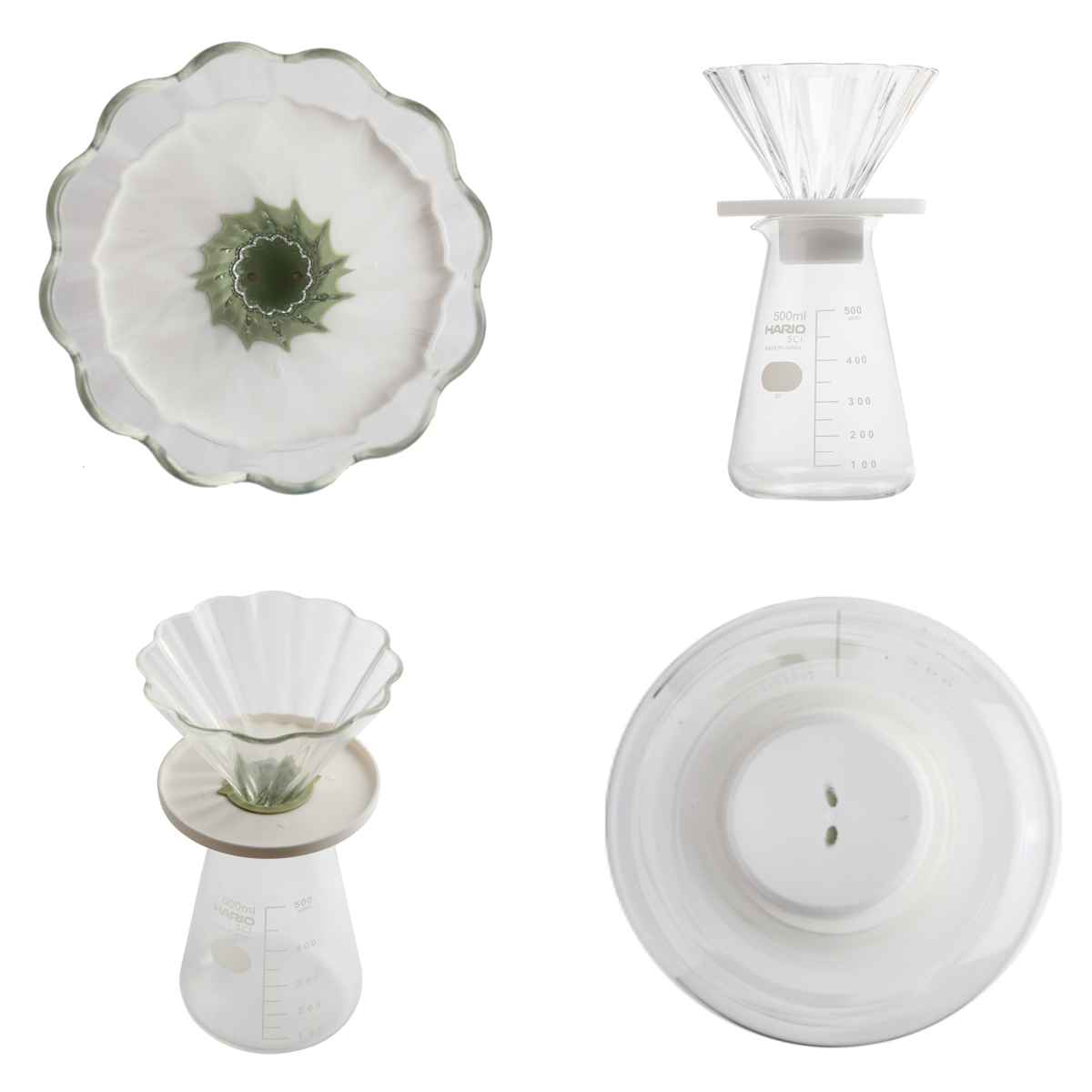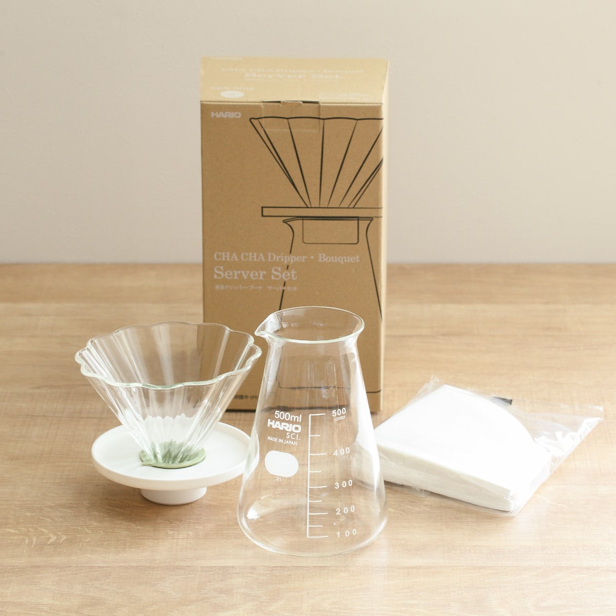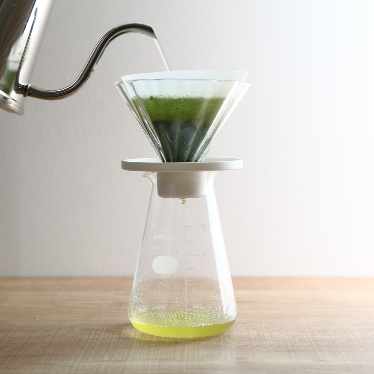 お茶のためのドリッパーセットです。ペーパーフィルターを使ってドリップするのですっきりとしたクリアな味わいのお茶を愉しめます。お茶の色がキレイに見えてテーブルを彩ります。