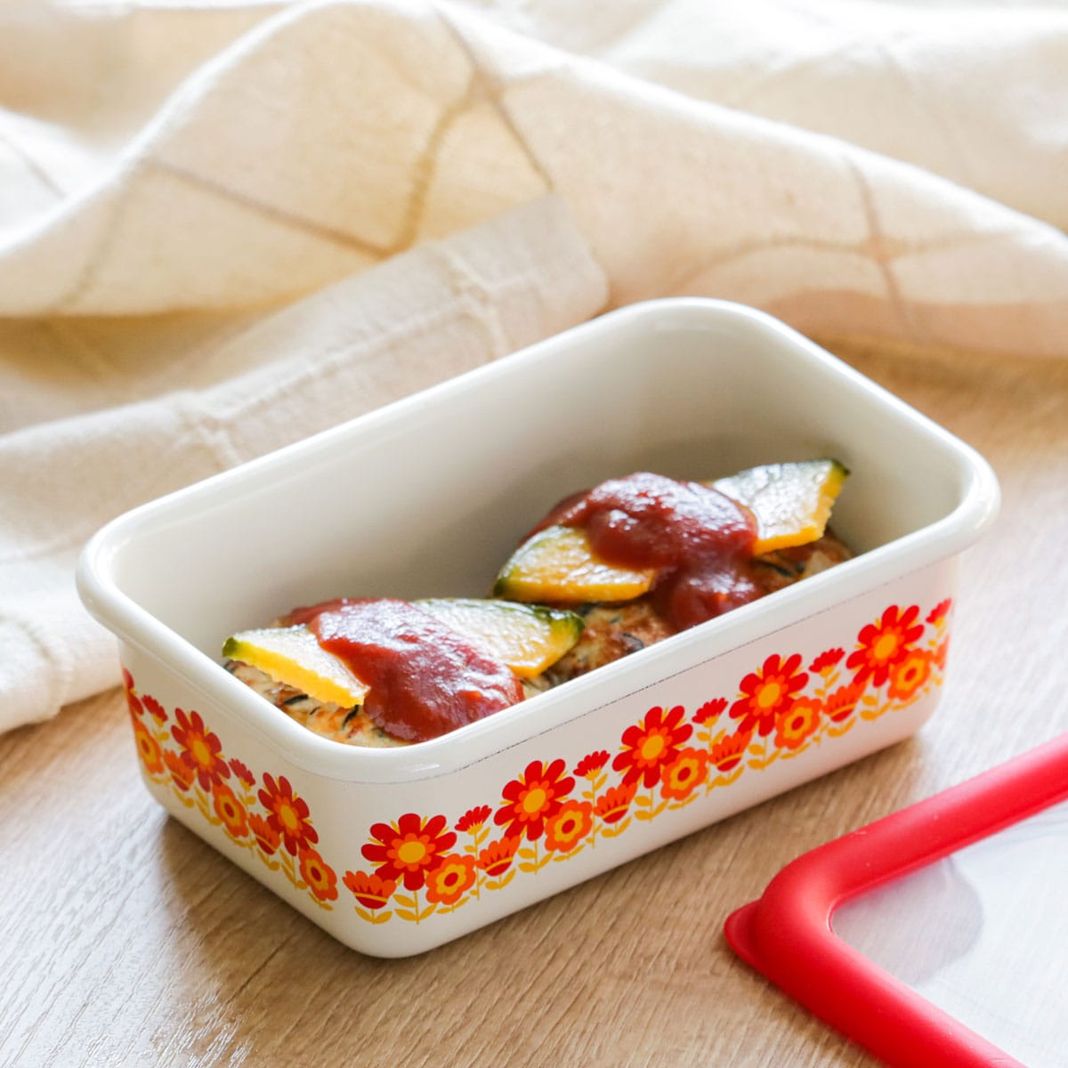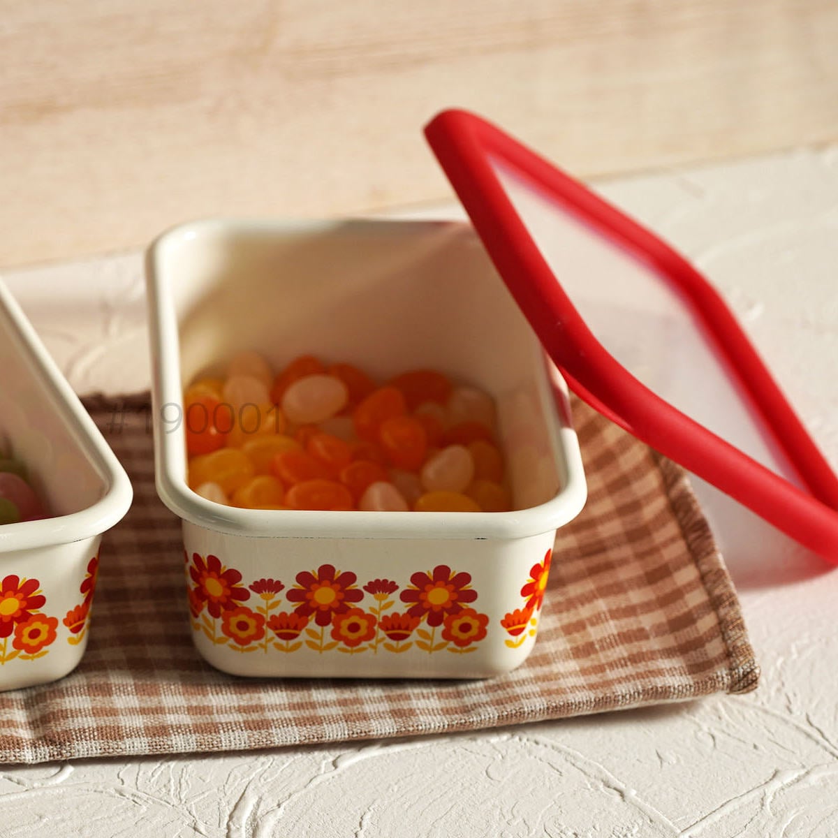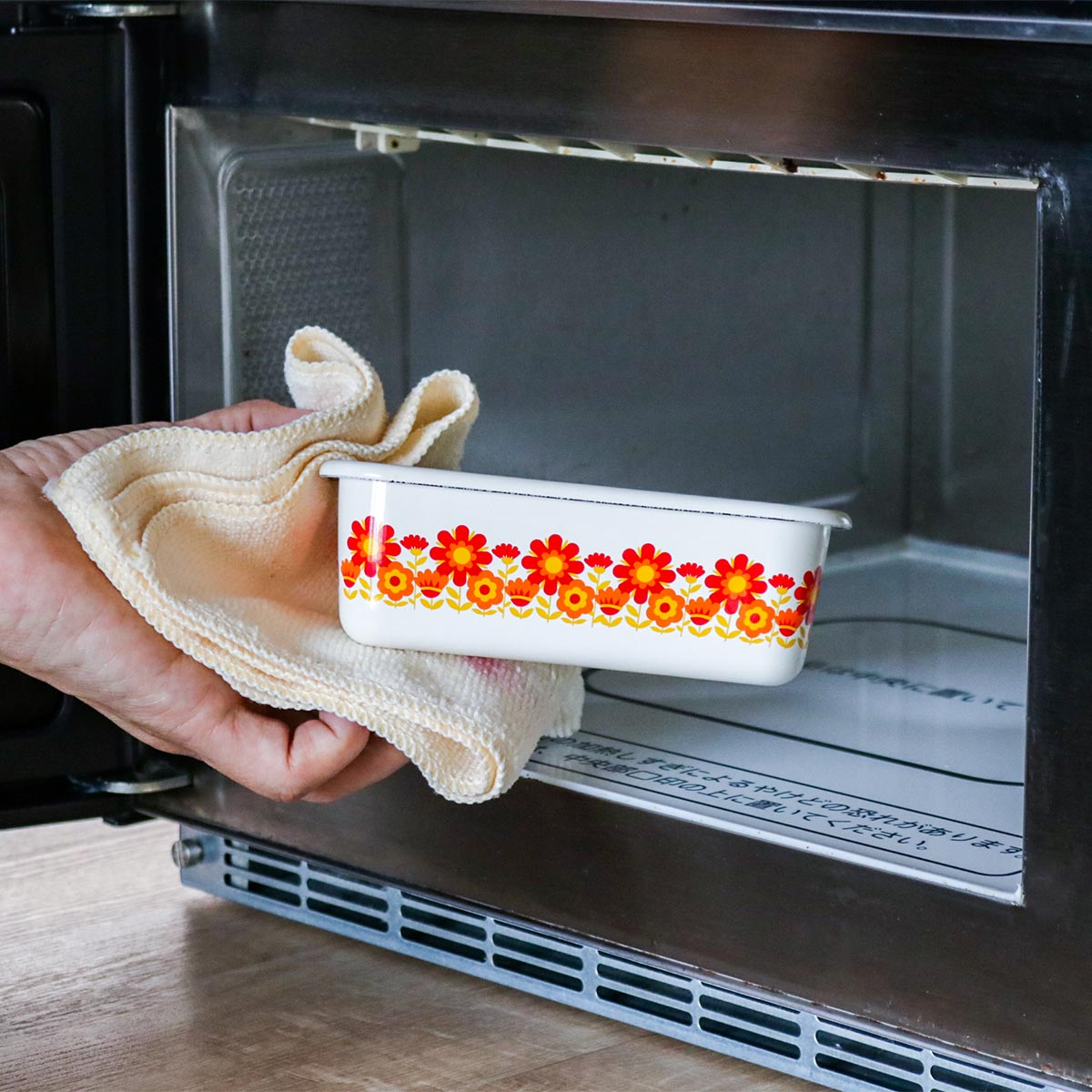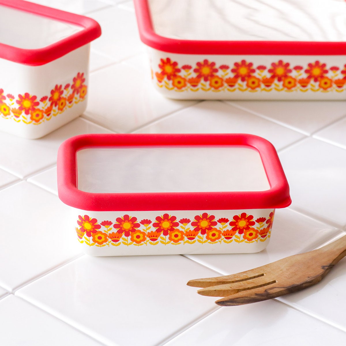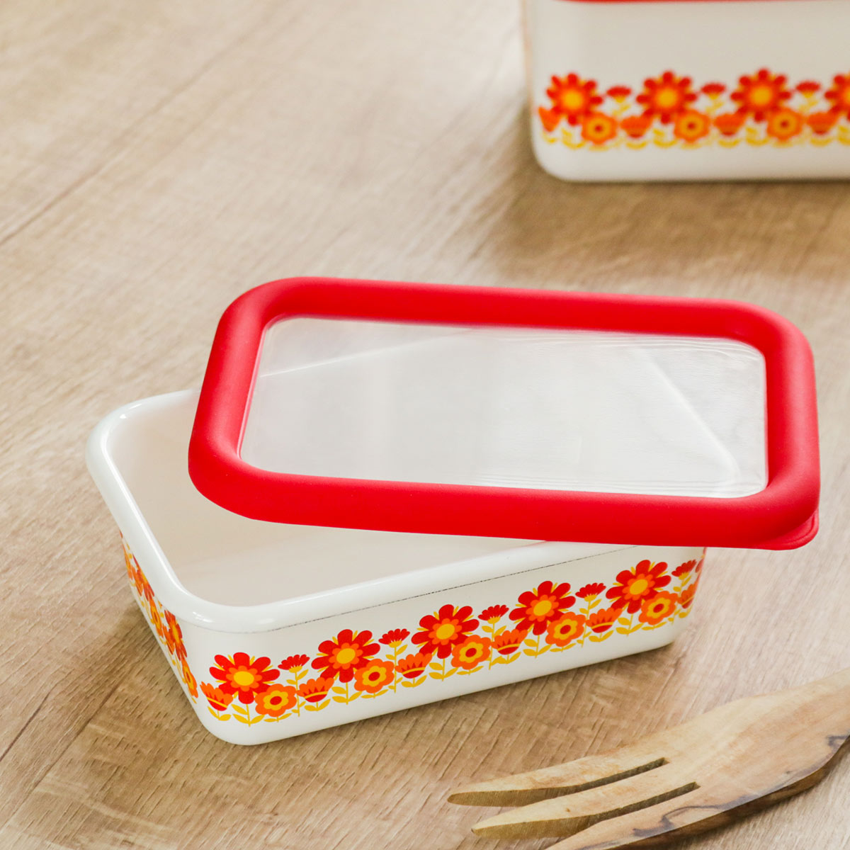 バット代わりに使って下ごしらえ、そのまま直火やオーブンにかけて調理と保存以外にも活躍します。レトロな雰囲気と鮮やかなデザインは、冷蔵庫から出してそのまま食器として食卓で使用することができます。