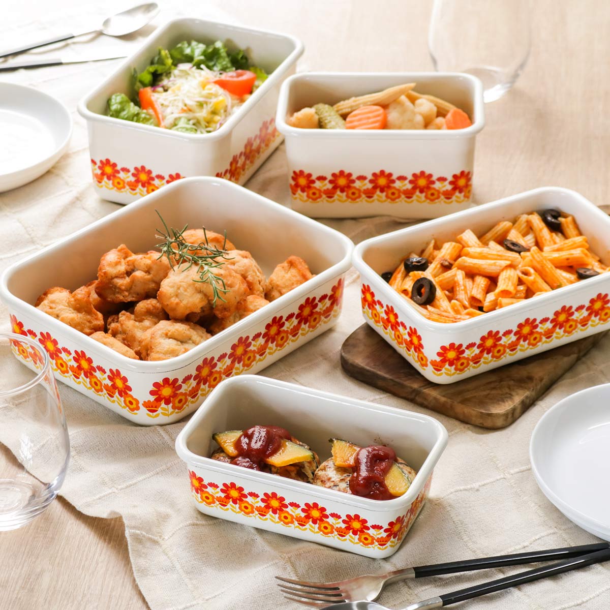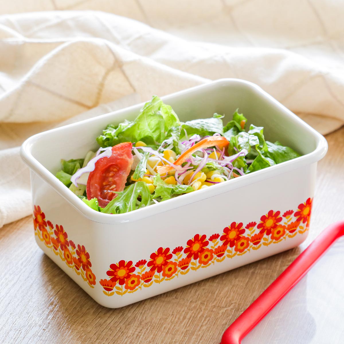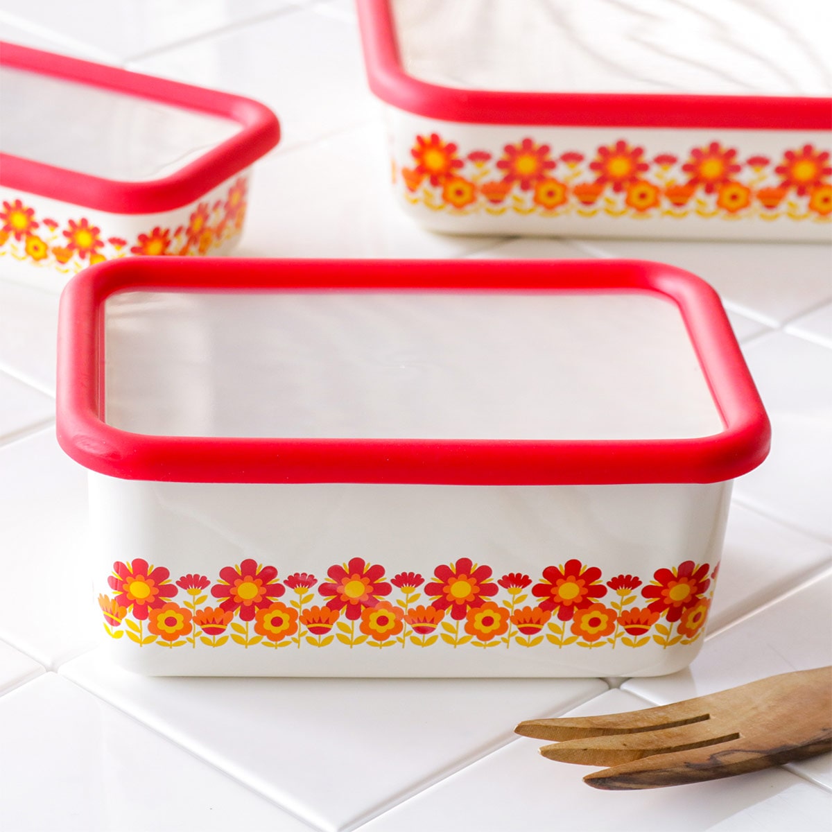 バット代わりに使って下ごしらえ、そのまま直火やオーブンにかけて調理と保存以外にも活躍します。レトロな雰囲気と鮮やかなデザインは、冷蔵庫から出してそのまま食器として食卓で使用することができます。
