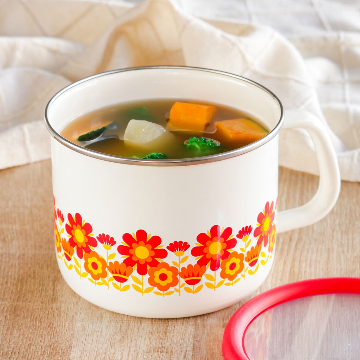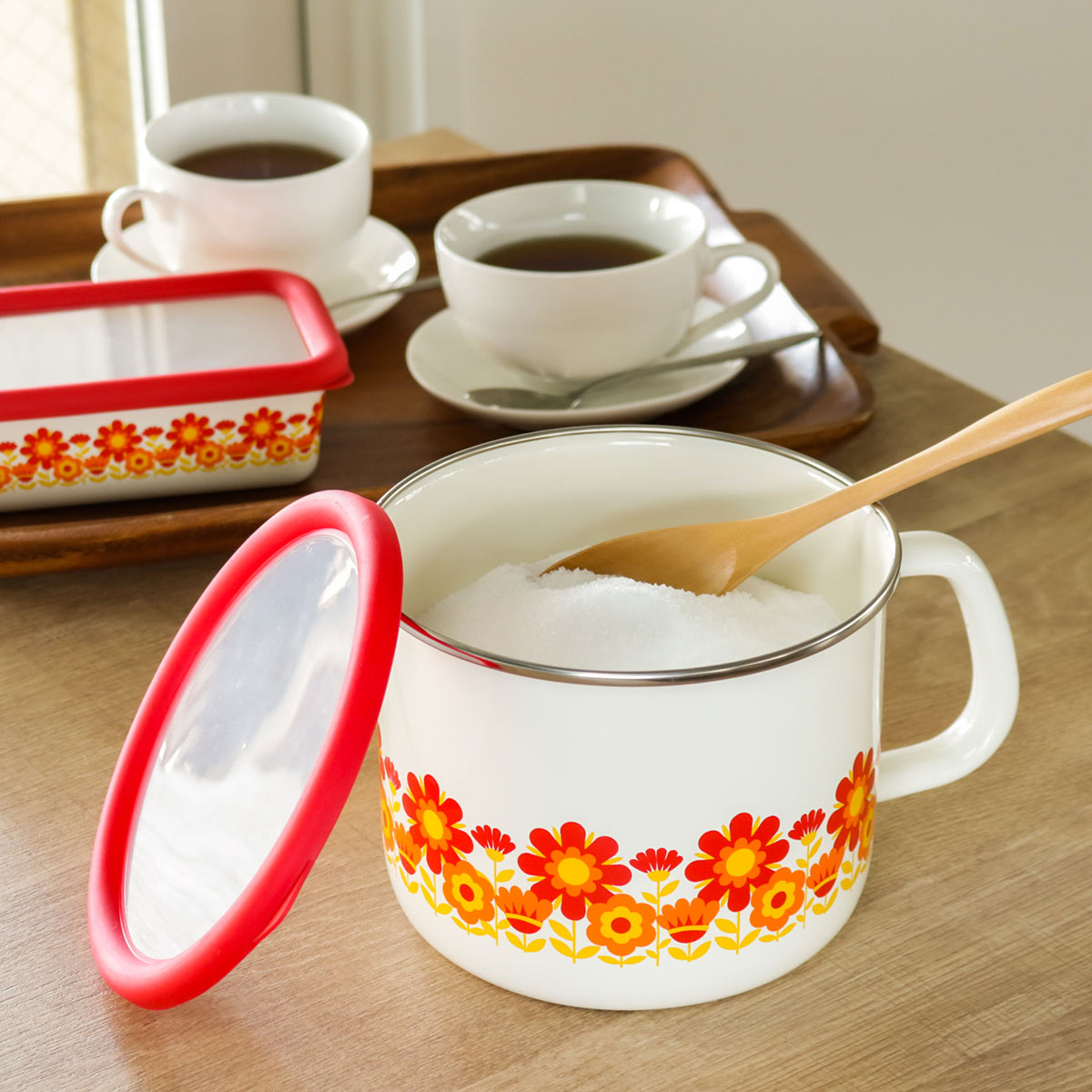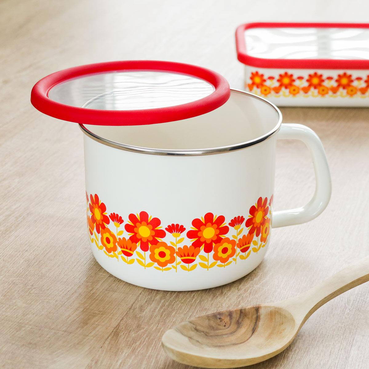 容器側面には、1970年代を代表するサンフラワー柄が描かれています。鮮やかなひまわりが赤く太陽のように燃えるキュートなデザインで、キッチンを明るく彩ってくれます。また、フタは丈夫で柔軟性のある素材で赤色に縁どられており、開けやすくて上から見ても可愛らしいデザインとなっております。