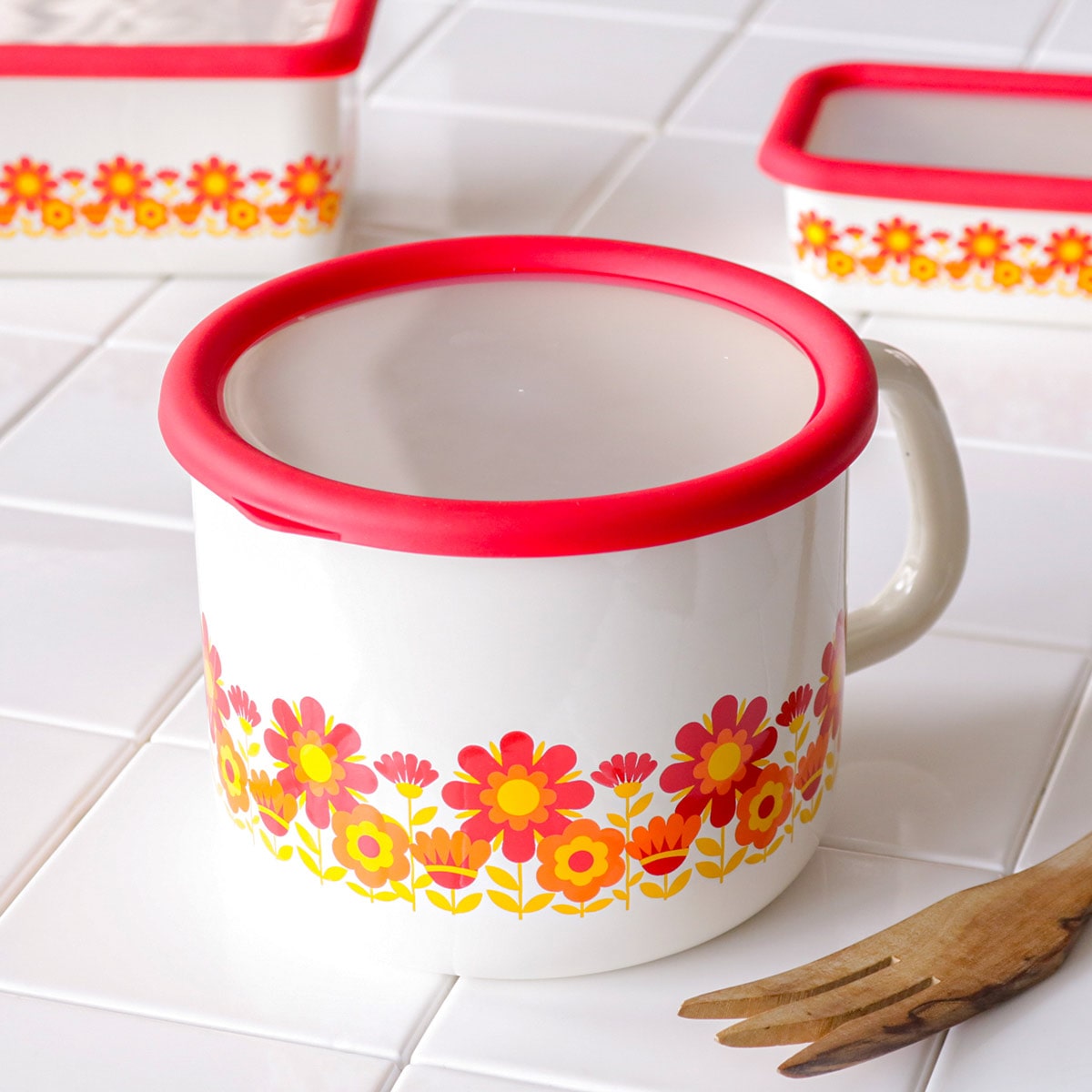 バット代わりに使って下ごしらえ、そのまま直火やオーブンにかけて調理と保存以外にも活躍します。調理中に便利な大きめの取っ手付きで、冷蔵庫の奥で保存していてもサッと出し入れしやすく、片手でも簡単に扱えます。また、レトロな雰囲気と鮮やかなデザインは、冷蔵庫から出してそのまま食器として食卓で使用することができます。