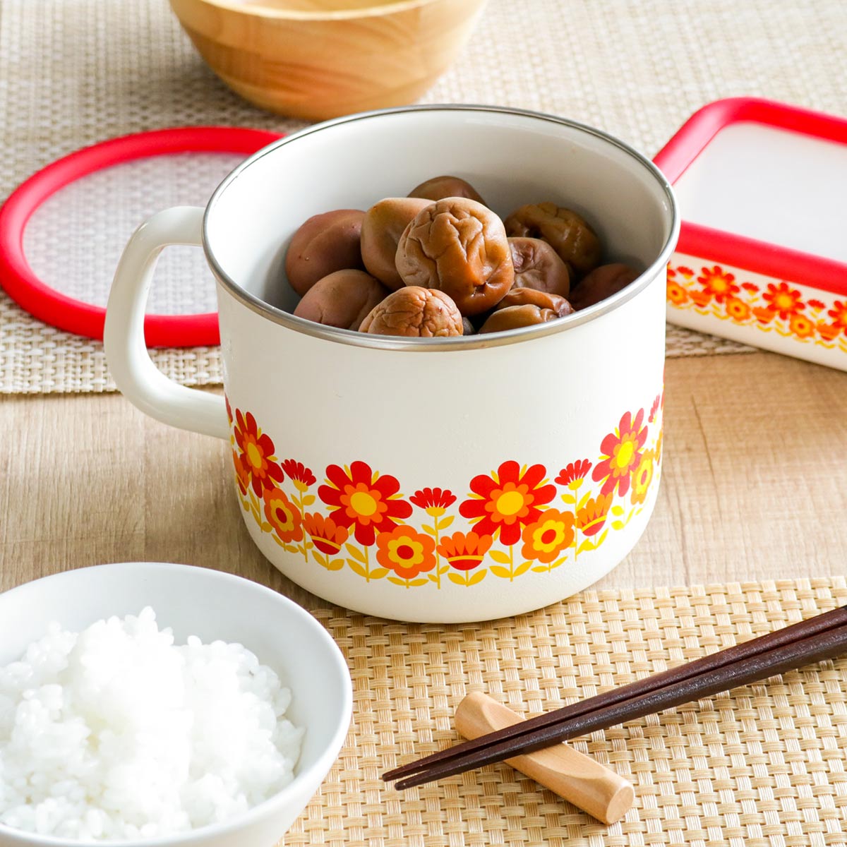 富士ホーローの歴史を振り返る「メモリーズ」シリーズ。創業75周年を記念し、1970年代に人気を博した当時の柄を復刻した昭和レトロなアイテムが揃っています。懐かしくレトロでありながら1周回って新しい、そんな時代の流れに思いを馳せつつキッチンライフが楽しめるシリーズです。用途や冷蔵庫の大きさ、お好みのサイズに合わせてお選びいただけます。