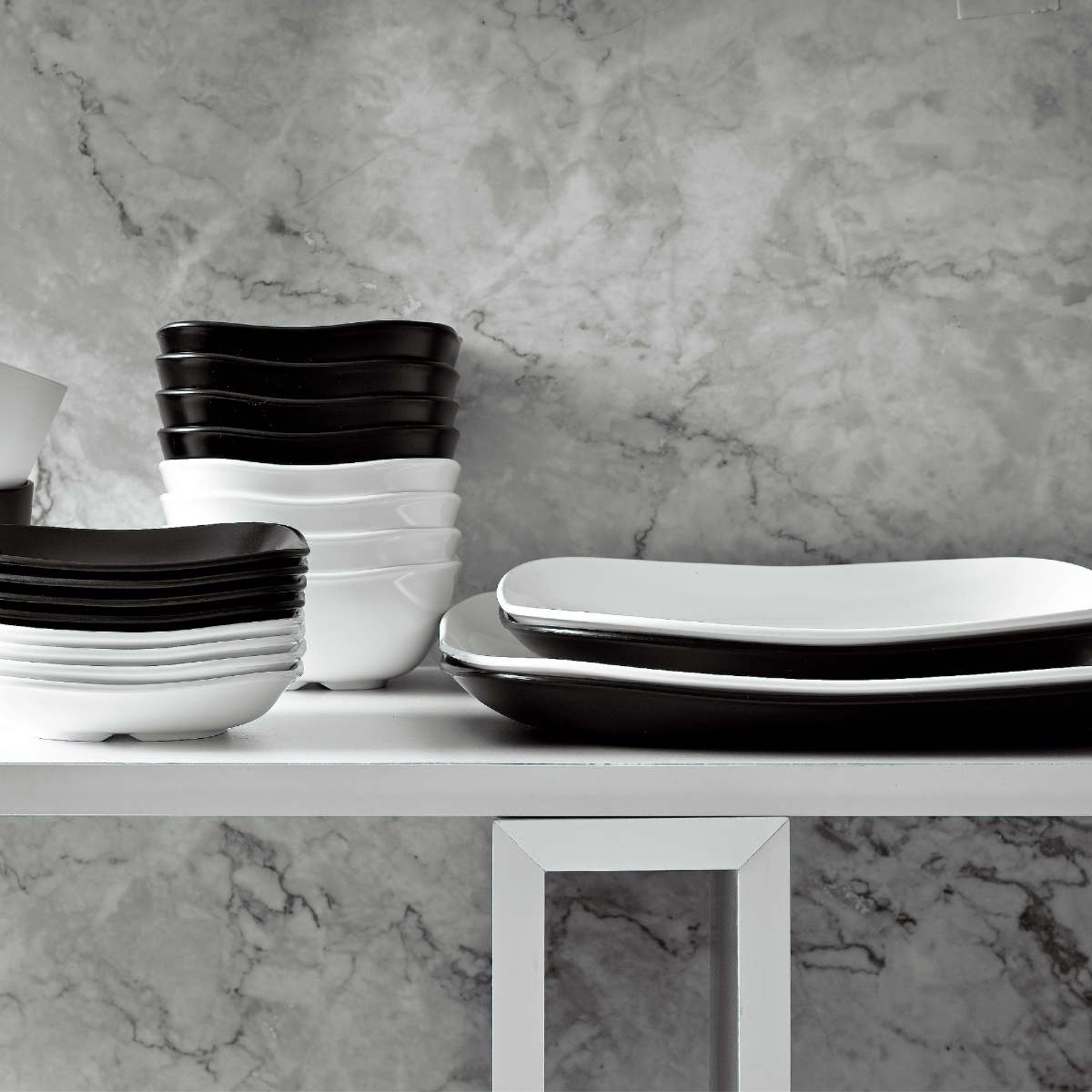 モダンスクエアプレートLの上に、モダンスクエアボウルやモダンスクエアプレートSが4枚ずつのせられ、お好みの組み合わせ使用ができます。