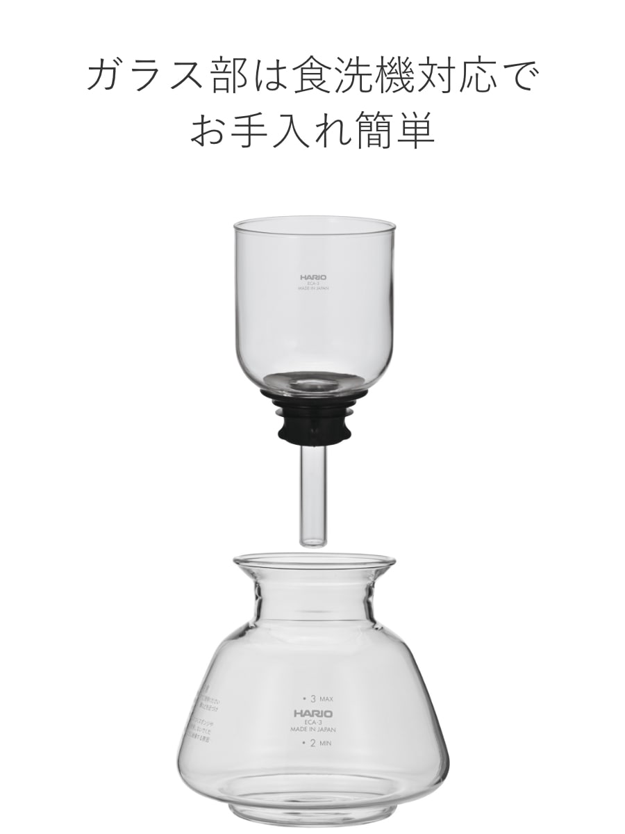 上ボールと下ボールはHARIOの耐熱ガラス製です。丸洗いOKで、食洗機にも対応しているのでお手入れが簡単です。