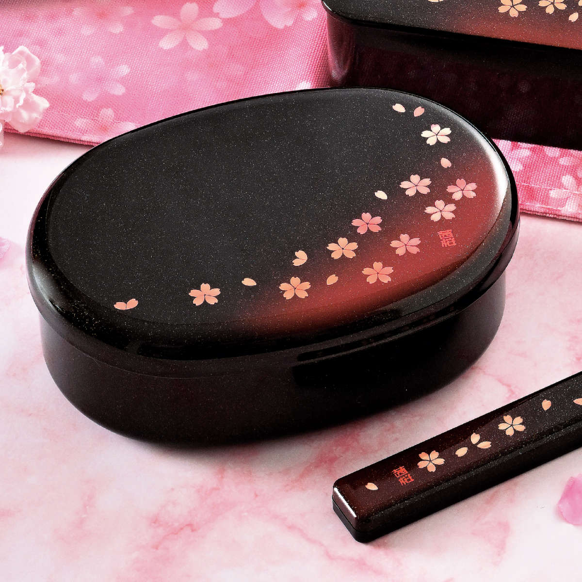 ラメの入った梨肌のような質感の梨地塗りに桜の花びらを散りばめた、上品で落ち着いたランチグッズが揃ったシリーズです。手にするたびに和の趣きを感じられ、毎日のお弁当作りの時間を楽しくしてくれます。