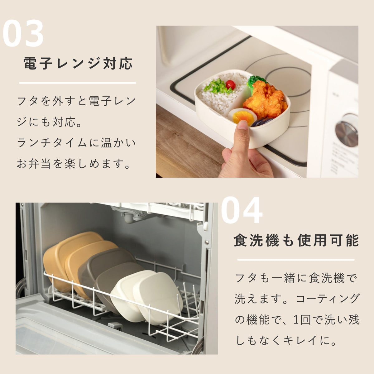 | 注意事項 | 熱に強い樹脂を使用しておりますが、耐熱温度を超えてしまいますと本体や蓋に変形が生じます。変形すると本体と蓋がうまく噛み合わない場合がございますので、電子レンジ・食洗器のご使用時は使用方法にご注意ください。 ・電子レンジは600Wで1分間を推奨しております。 ・食洗器は標準モードでご使用ください。伏せておき、上に物は載せないようにお願いします。 ・食洗器内では熱風が直接あたる場所等には置かないようにご注意ください。 |