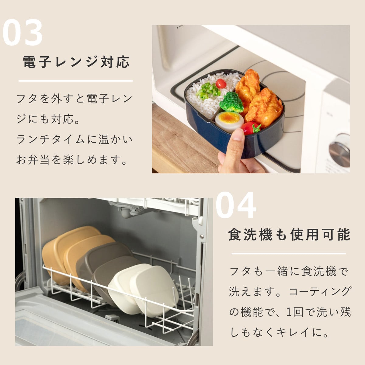 | 注意事項 | 熱に強い樹脂を使用しておりますが、耐熱温度を超えてしまいますと本体や蓋に変形が生じます。変形すると本体と蓋がうまく噛み合わない場合がございますので、電子レンジ・食洗器のご使用時は使用方法にご注意ください。 ・電子レンジは600Wで1分間を推奨しております。 ・食洗器は標準モードでご使用ください。伏せておき、上に物は載せないようにお願いします。 ・食洗器内では熱風が直接あたる場所等には置かないようにご注意ください。 |