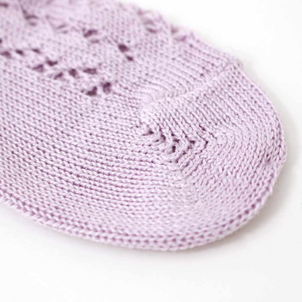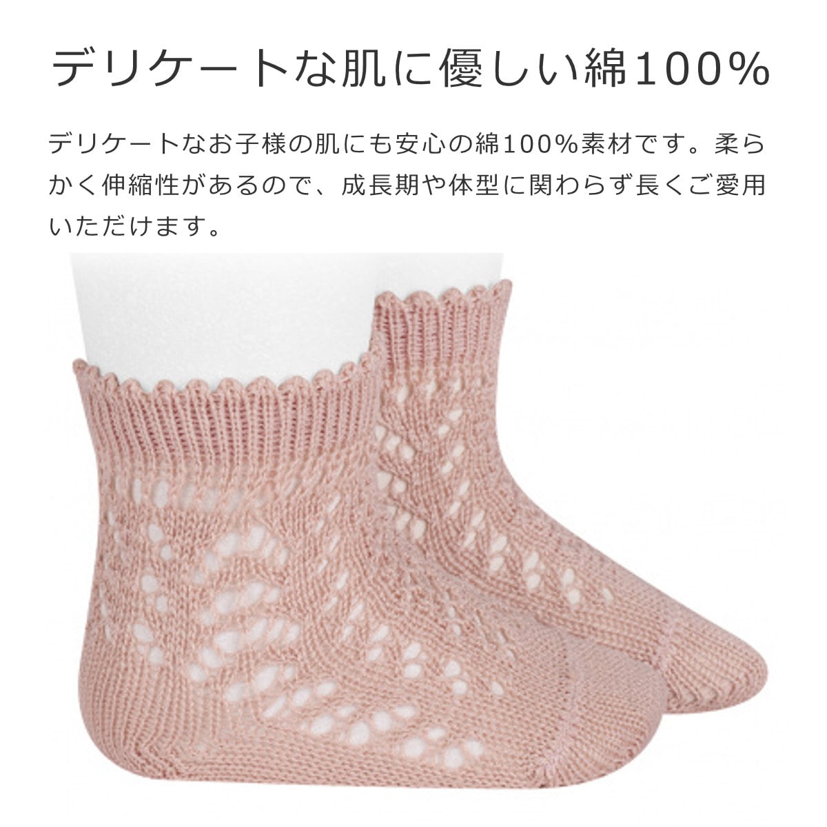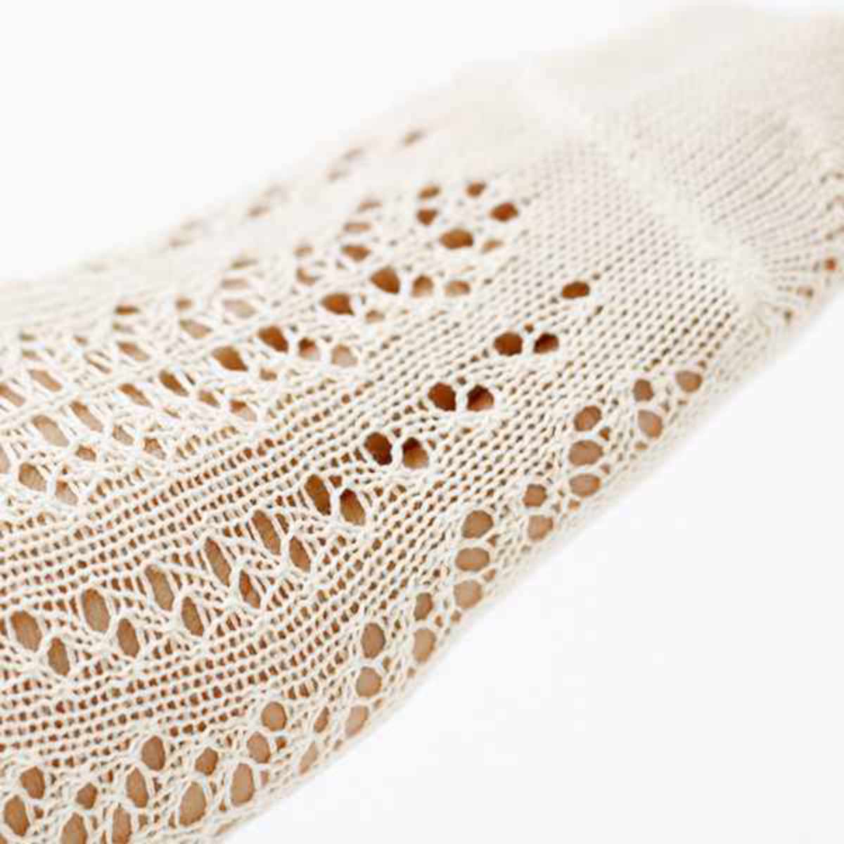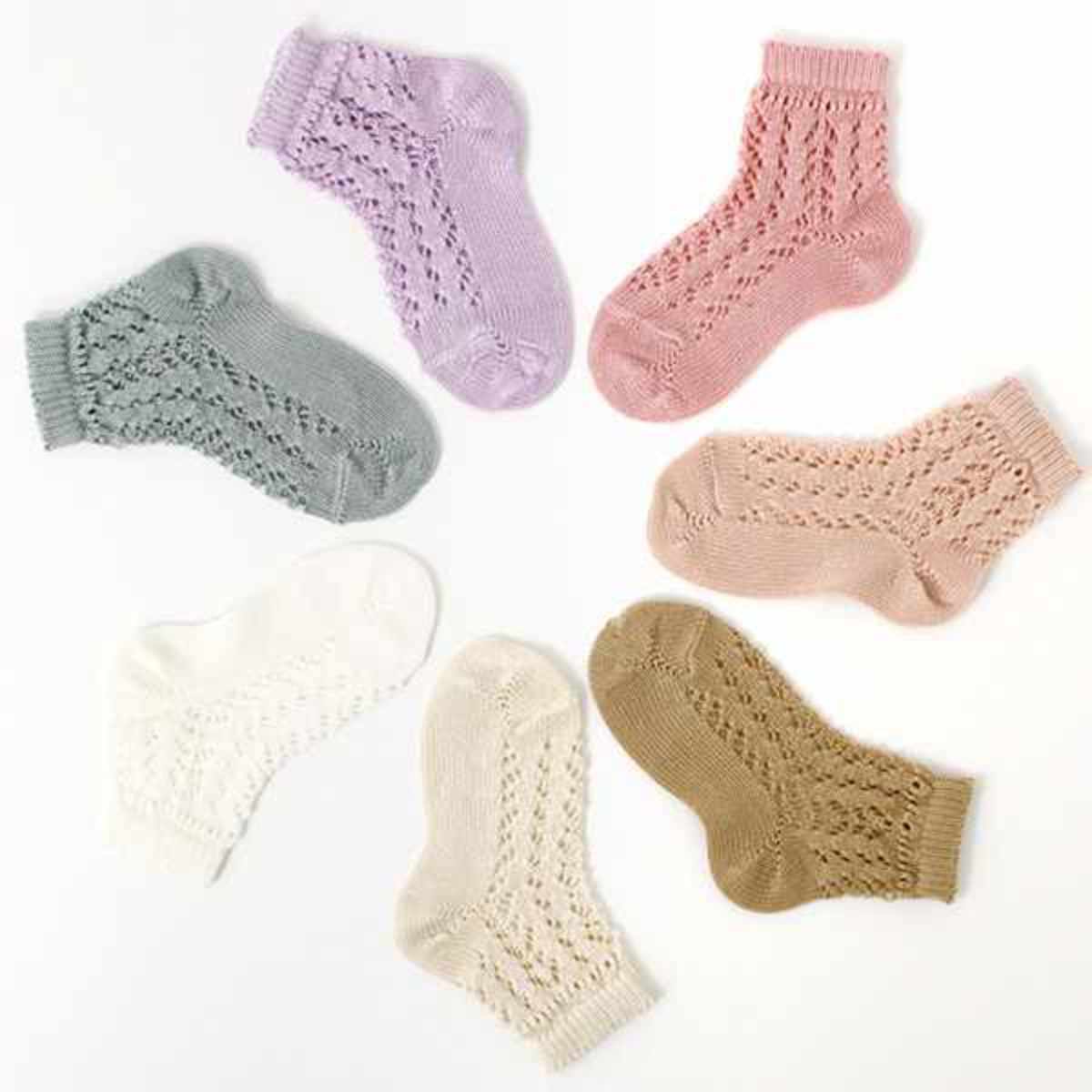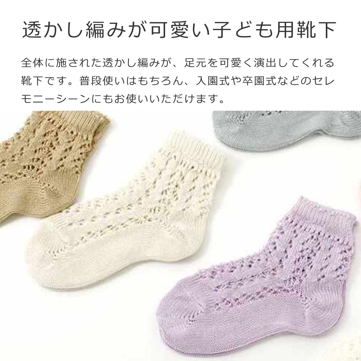 全体に施された透かし編みが、足元を可愛く演出してくれる子ども用靴下です。シンプルながらもお洒落に見えるデザインなので、普段使いはもちろん、入園式や卒園式などのセレモニーシーンにもお使いいただけます。