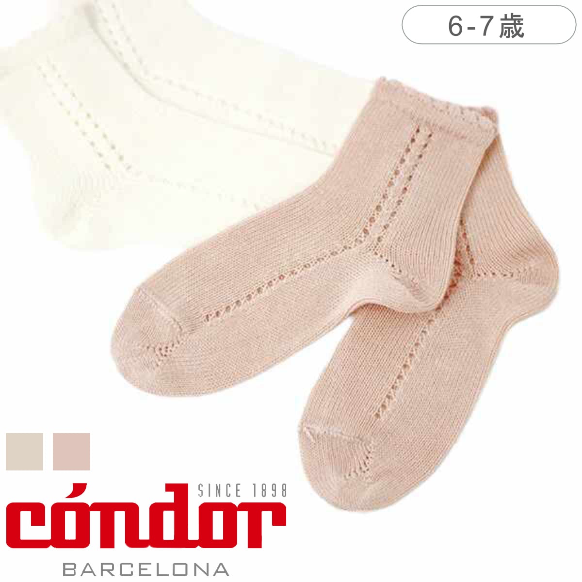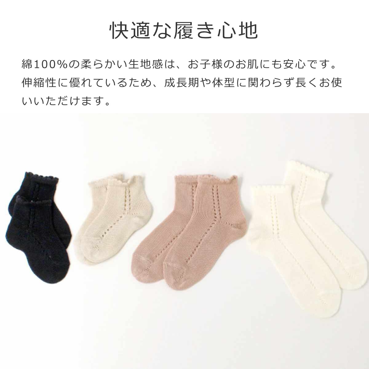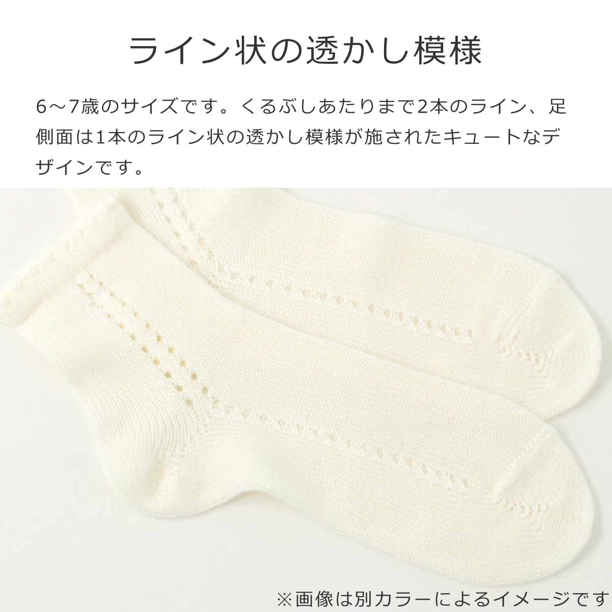 6~7歳のサイズです。くるぶしあたりまで2本のライン、足側面は1本のライン状の透かし模様が施されたキュートなデザインです。普段着からお出かけ時まで、足元を可愛く演出してくれます。