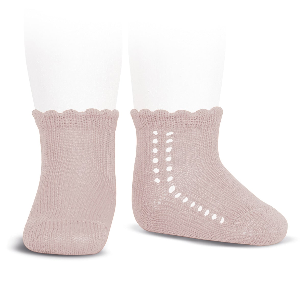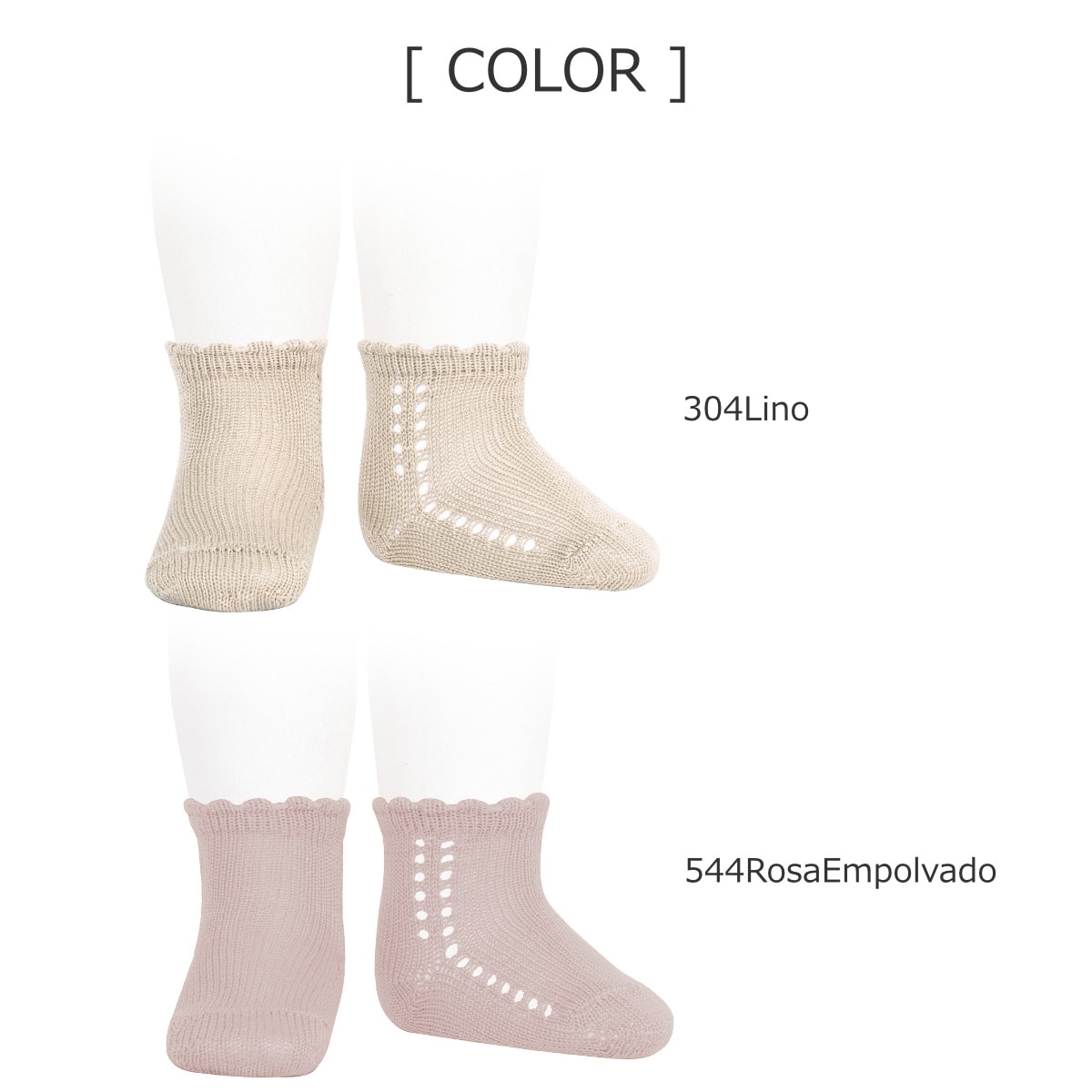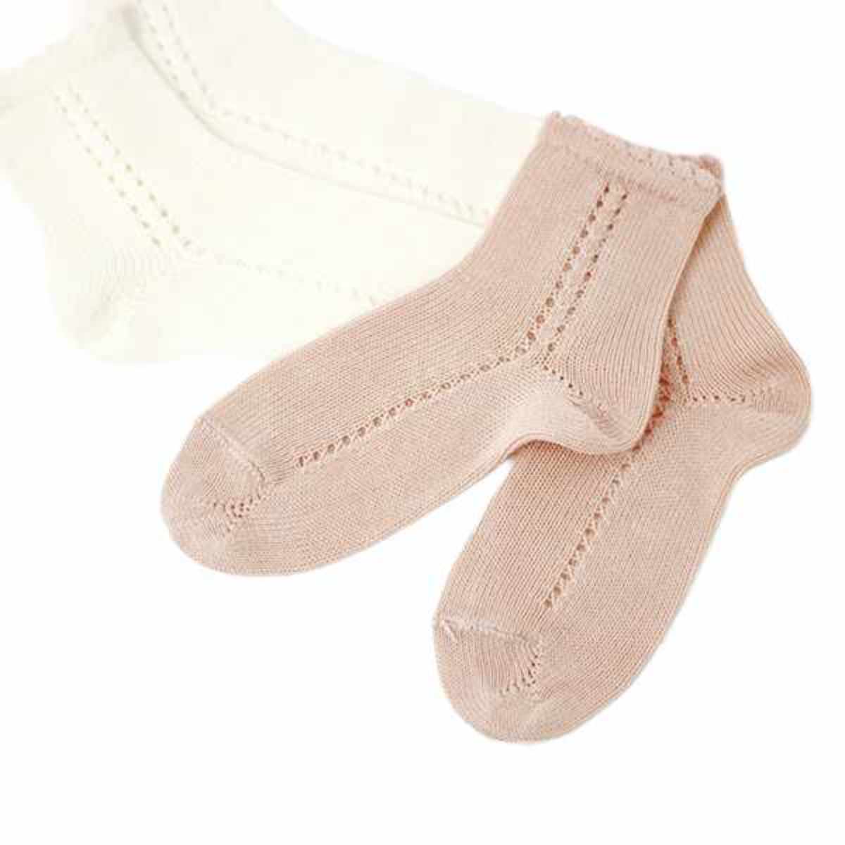 6~7歳のサイズです。くるぶしあたりまで2本のライン、足側面は1本のライン状の透かし模様が施されたキュートなデザインです。普段着からお出かけ時まで、足元を可愛く演出してくれます。