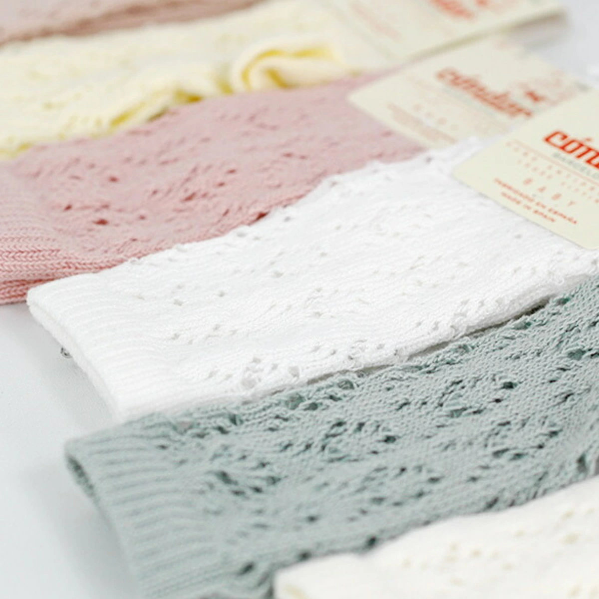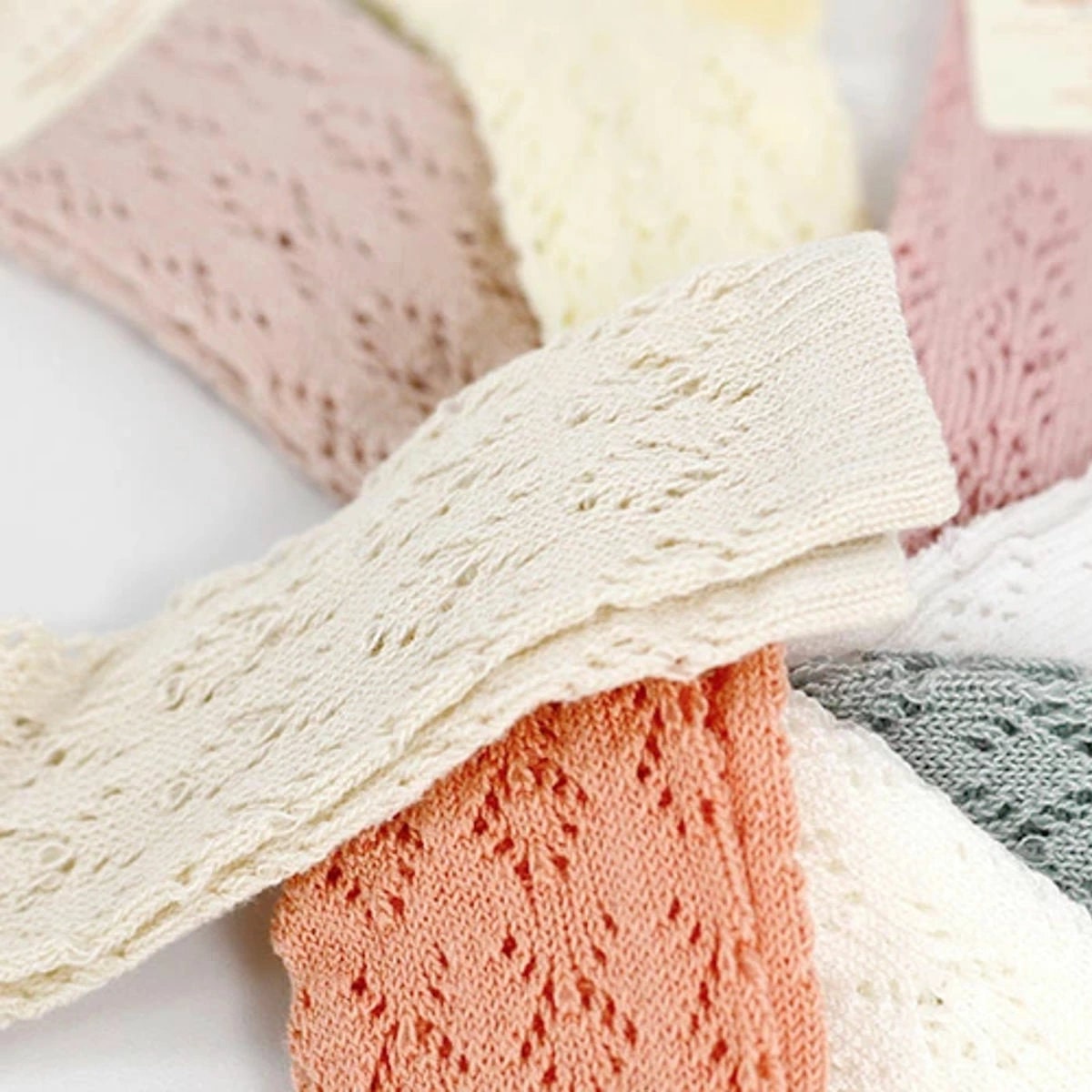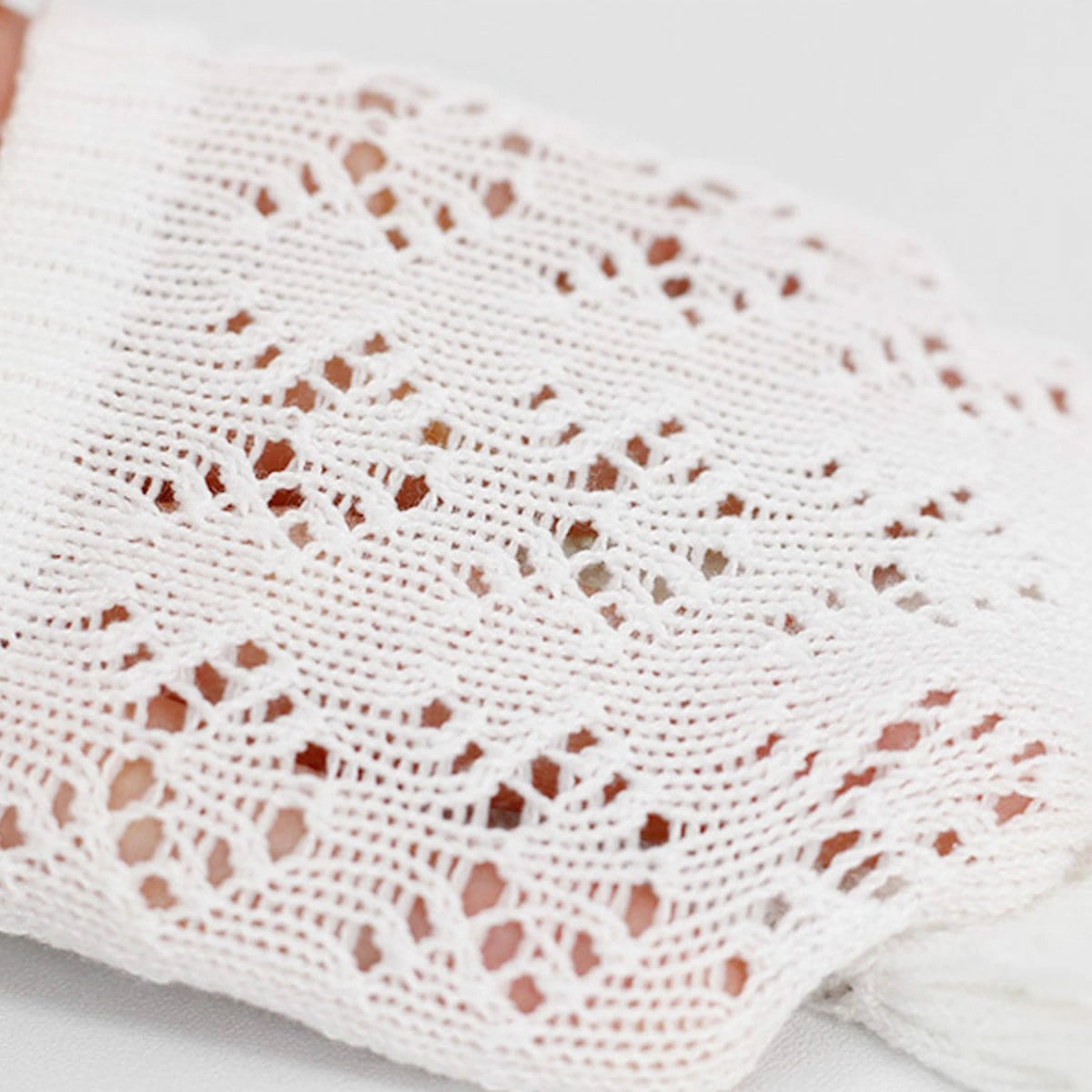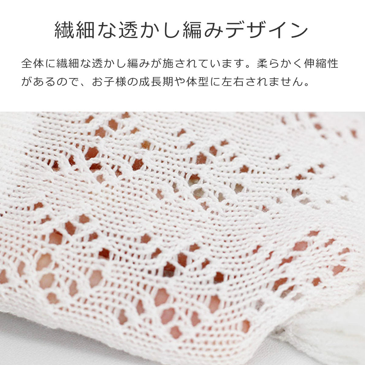 全体に繊細な透かし編みが施されています。柔らかく伸縮性があるので、お子様の成長期や体型に左右されません。
