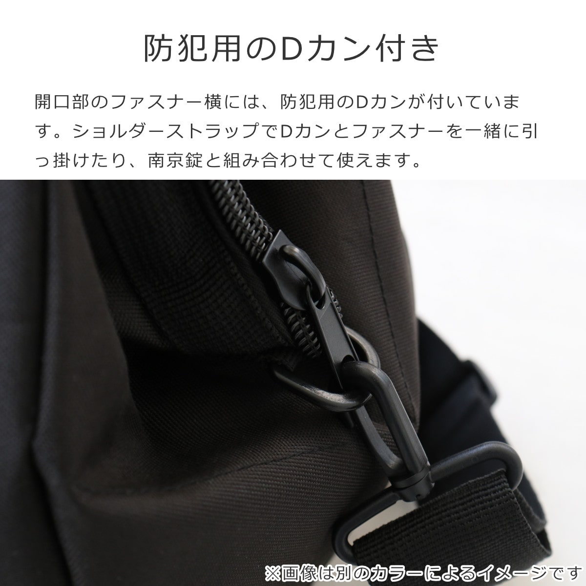 開口部のファスナー横には、防犯用のDカンが付いています。ショルダーストラップでDカンとファスナーを一緒に引っ掛けたり、南京錠と組み合わせて使えます。旅行時にも大切な荷物をしっかりと守ることができます。