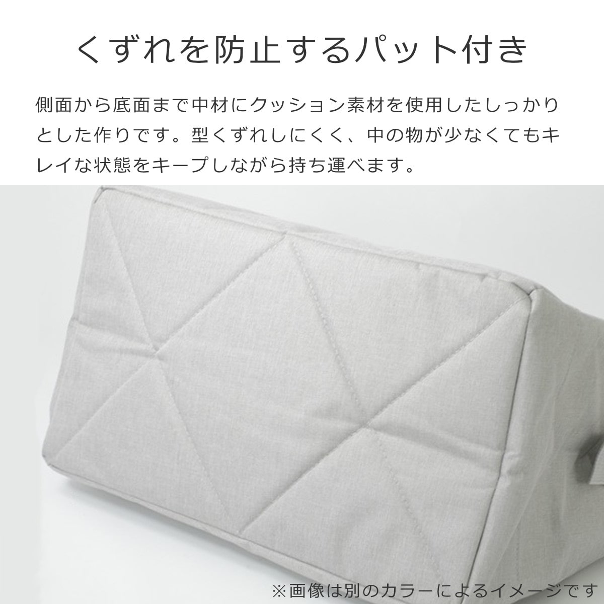 側面から底面まで中材にクッション素材を使用したしっかりとした作りです。型くずれしにくく、中の物が少なくてもキレイな状態をキープしながら持ち運べます。