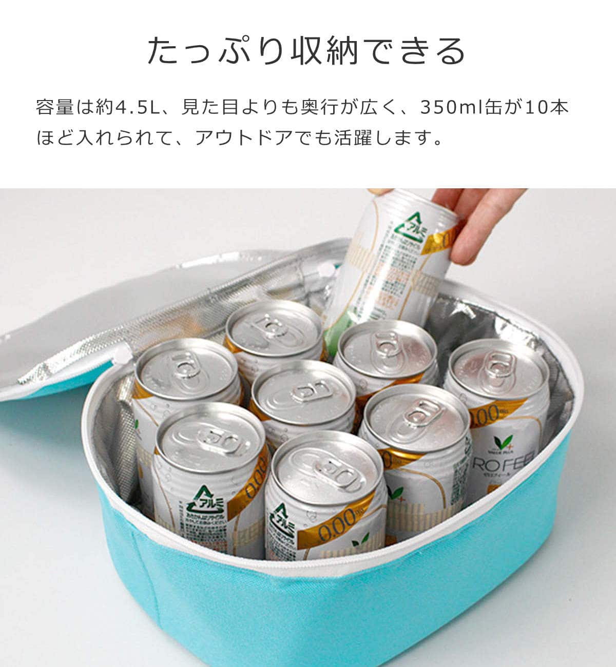 容量は約4.5L、ランチやおやつの持ち運びにぴったりなサイズです。見た目よりも奥行が広く、350ml缶が10本ほど入れられて、アウトドアでも活躍します。