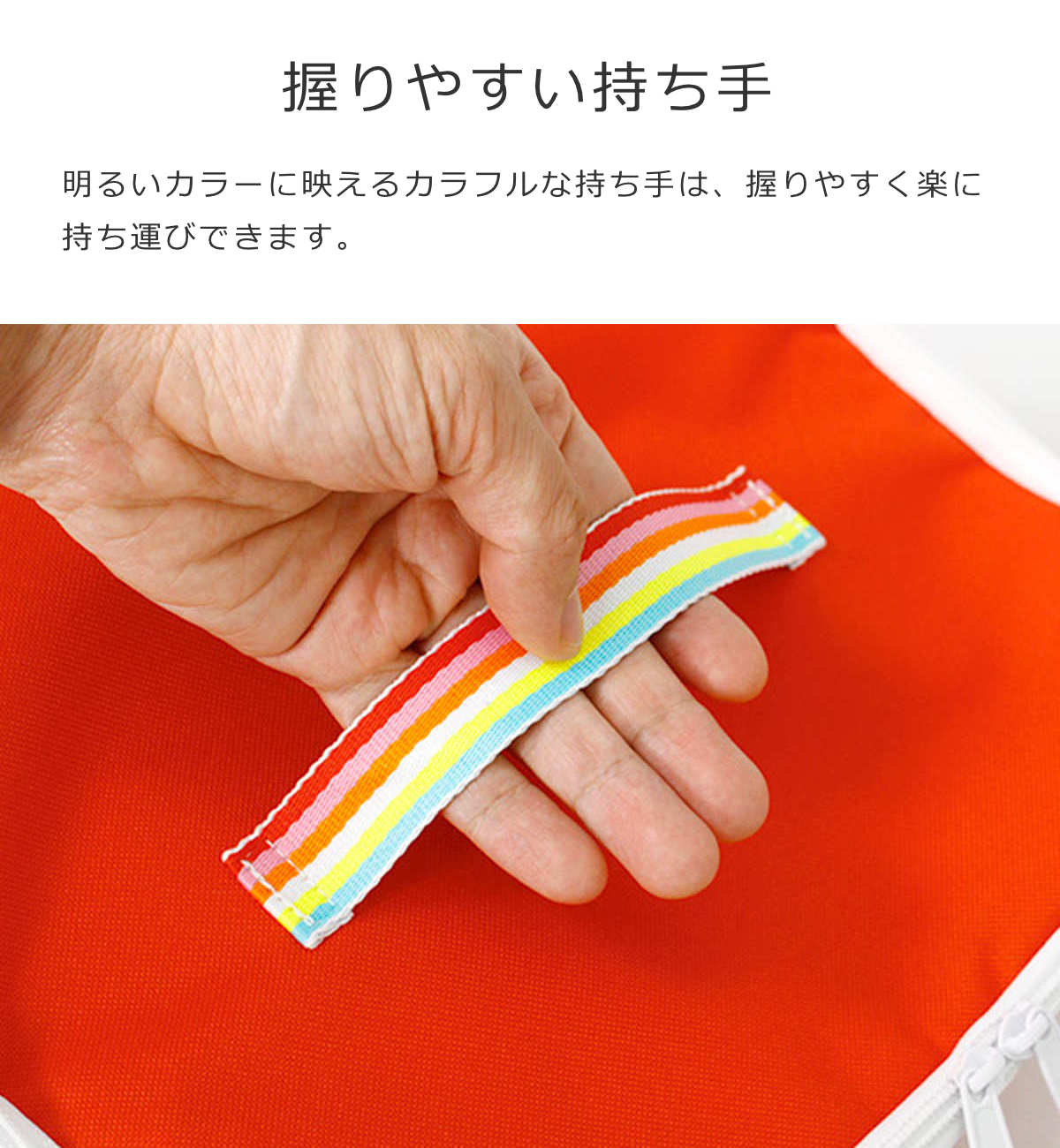 明るいカラーに映えるカラフルな持ち手は、握りやすく楽に持ち運びできます。