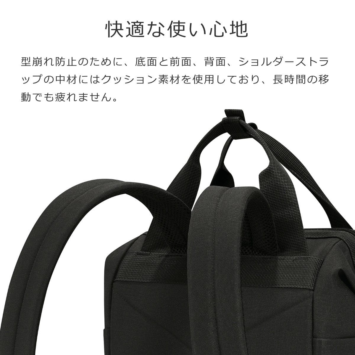 ショルダーストラップ、前面、背面、底面の中材にはクッション素材を使用しています。型崩れを防止し、長時間の移動でも疲れにくいです。ショルダーベルトは長さ調節が可能なのでお好みの長さでお使いください。