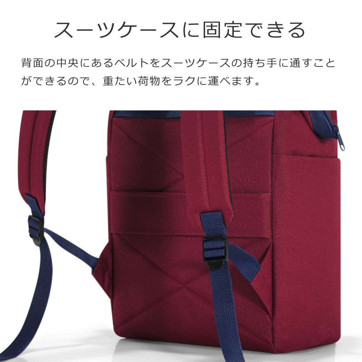 背面の中央にあるベルトをスーツケースの持ち手に通すことができるので、重たい荷物も楽に運べます。