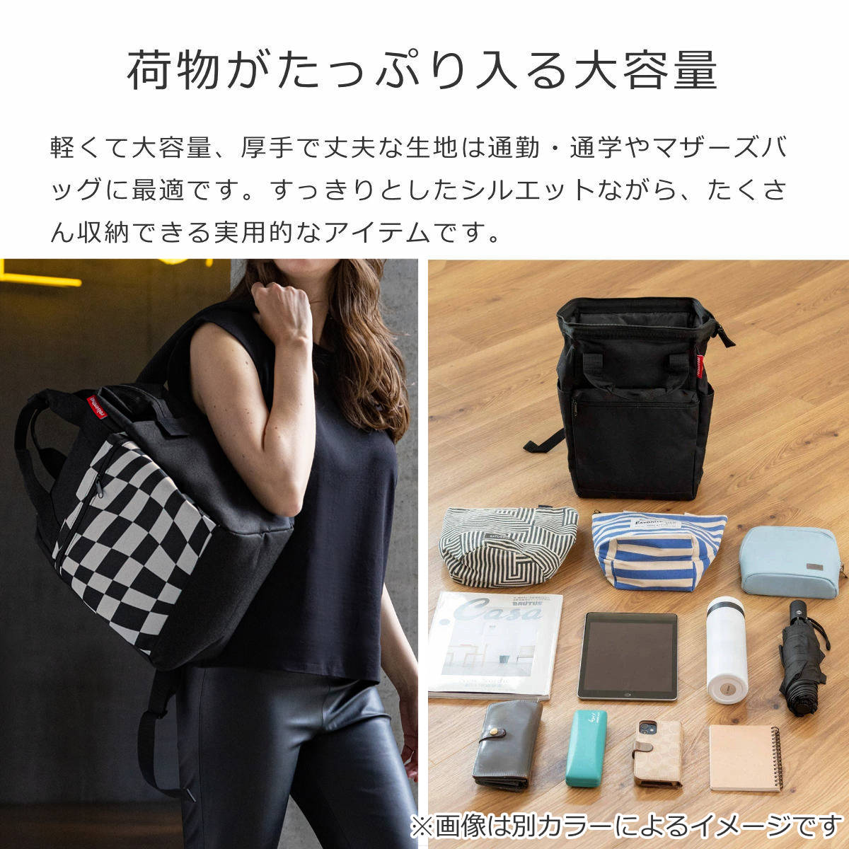 厚手の丈夫な生地は通勤・通学やマザーズバッグにピッタリです。スッキリとしたシルエットながら、容量12Lの大容量タイプでたくさん収納できます。