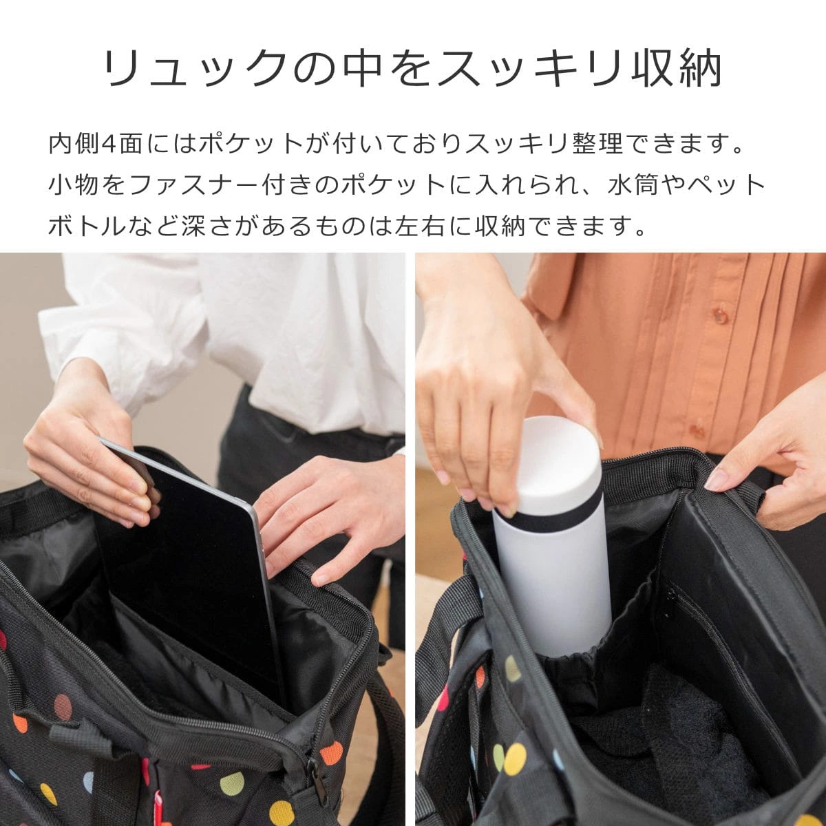 内側の4面にはポケットが付いています。ファスナー付きのポケットに携帯や小物を入れられ、左右にはペットボトルや折り畳み傘など深さがあるものを収納できます。