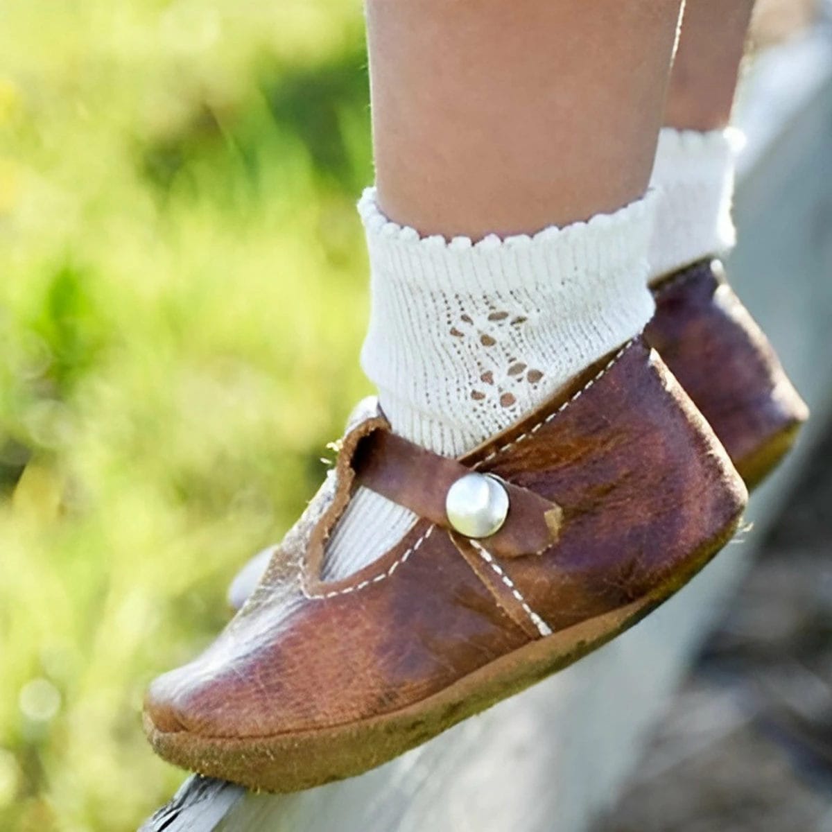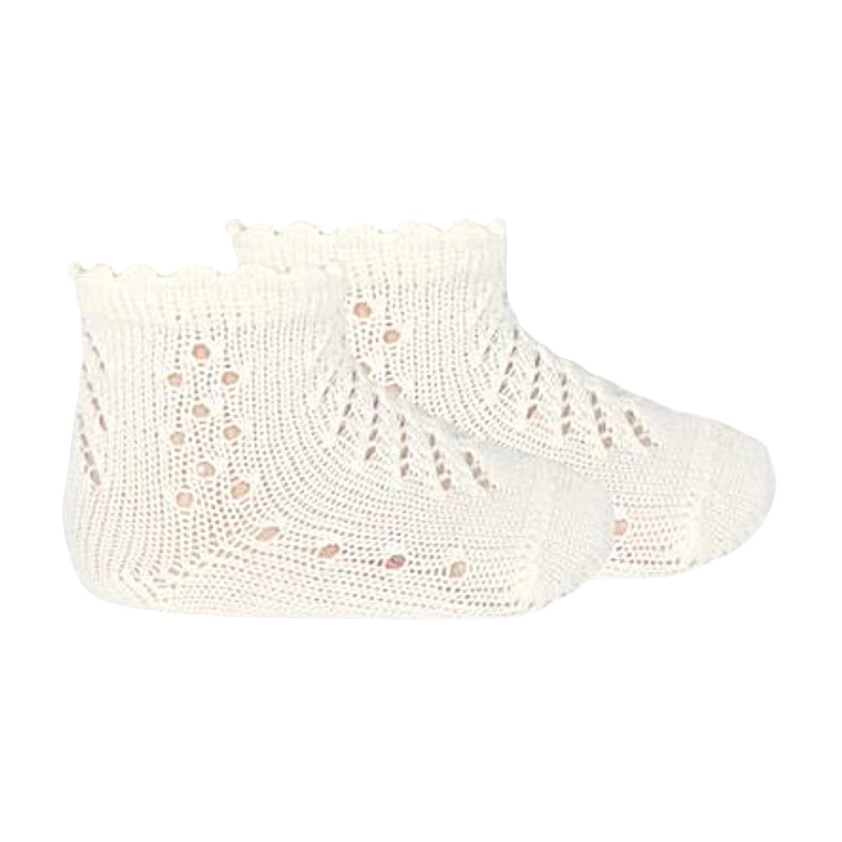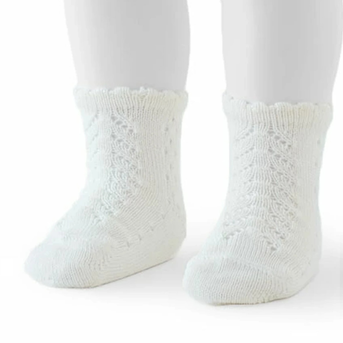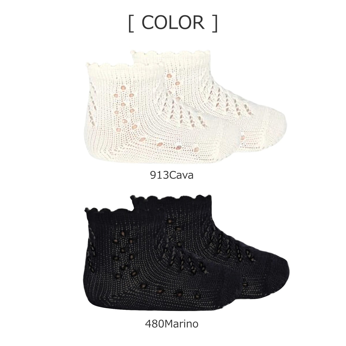 全体に透かし編みが施されています。素材には柔らかく伸縮性のある綿を100%使用しており、お子様のお肌に優しい履き心地です。
