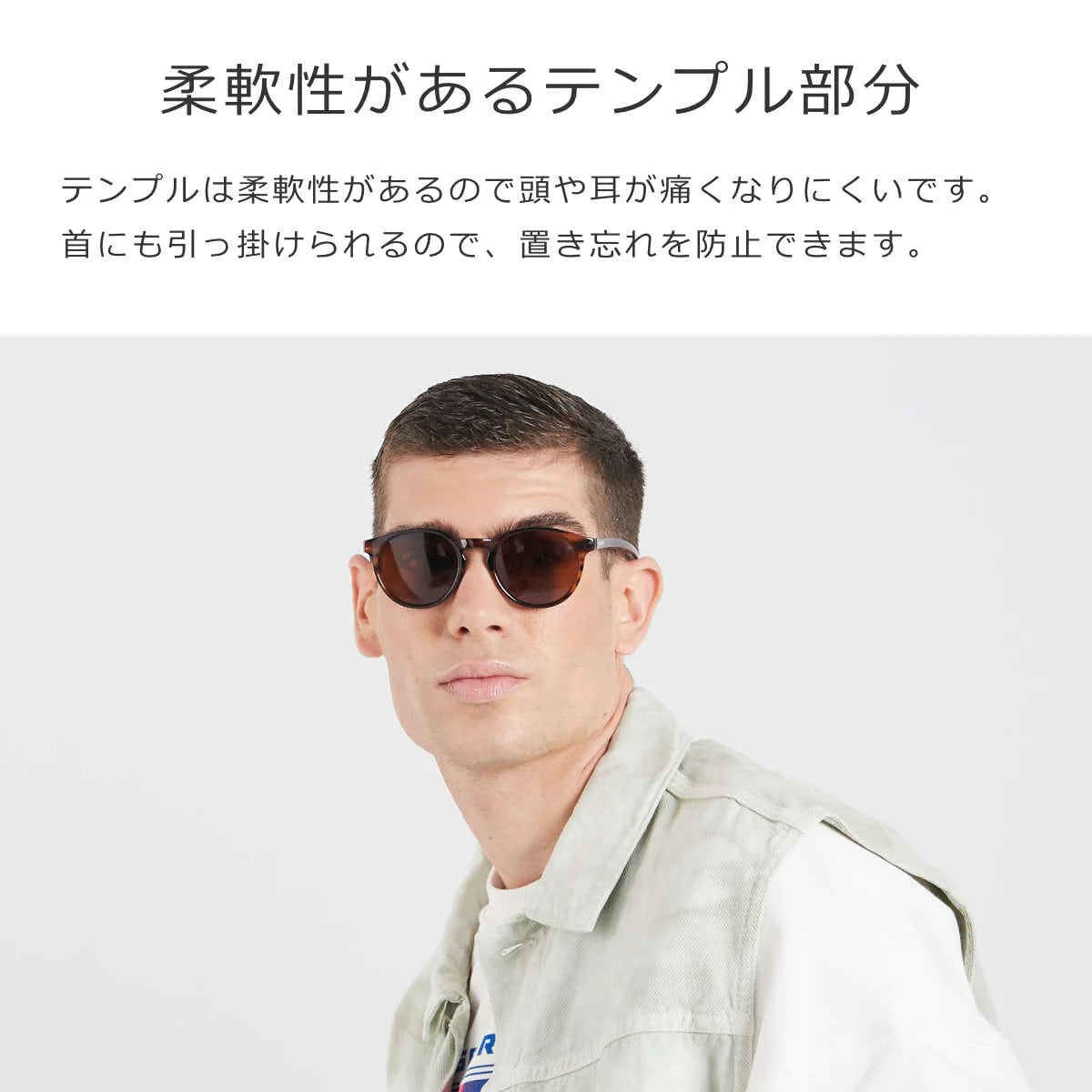 テンプルは柔軟性があるので頭や耳が痛くなりにくく、サングラスを掛けたままヘルメットを被ってもズレにくいフィット感です。首にも引っ掛けられるので、置き忘れを防止できます。
