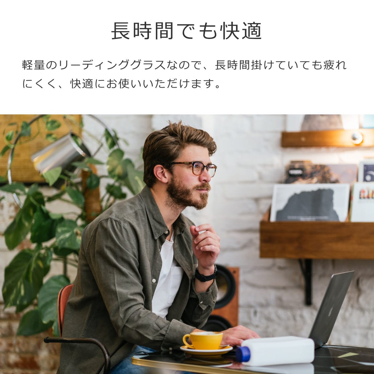 耐久性に優れた軽量のリーディンググラスなので、長時間掛けていても疲れにくく、ズレることなく快適にお使いいただけます。
