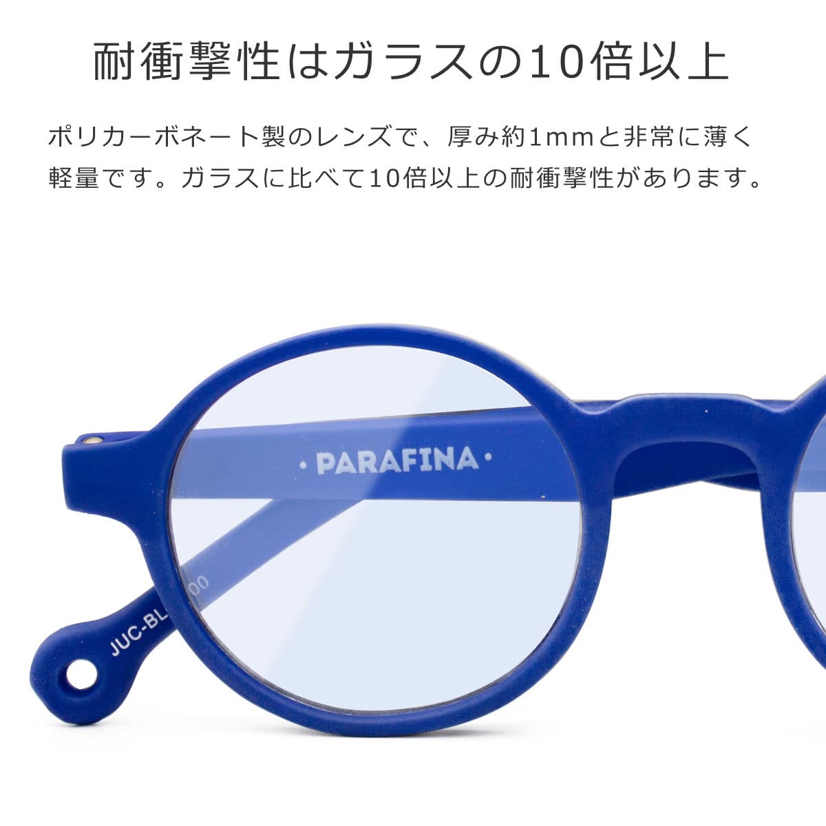 ポリカーボネート製のレンズは、厚み約1mmと非常に薄く軽量です。ガラスに比べて10倍以上の耐衝撃性があるので、安心してお使いいただけます。