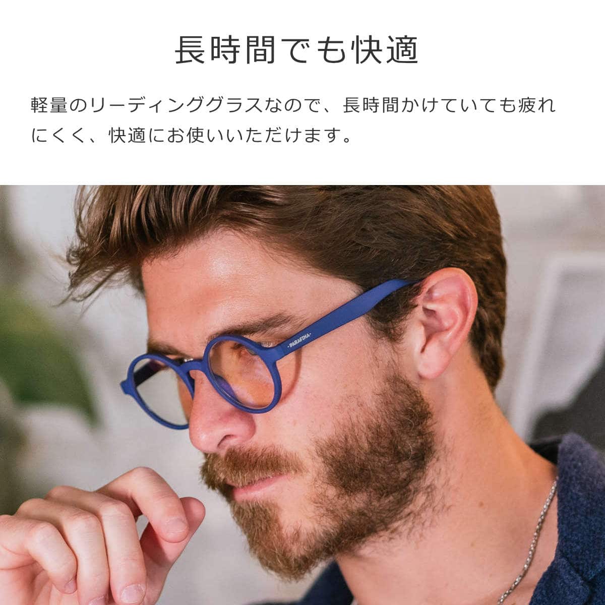 耐久性に優れた軽量のリーディンググラスなので、長時間掛けていても疲れにくく、ズレることなく快適にお使いいただけます。
