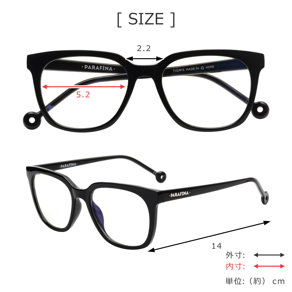 | サイズ | レンズ幅:約 5.2(cm) ブリッジ:約 2.2(cm) テンプル:約 14(cm) |
