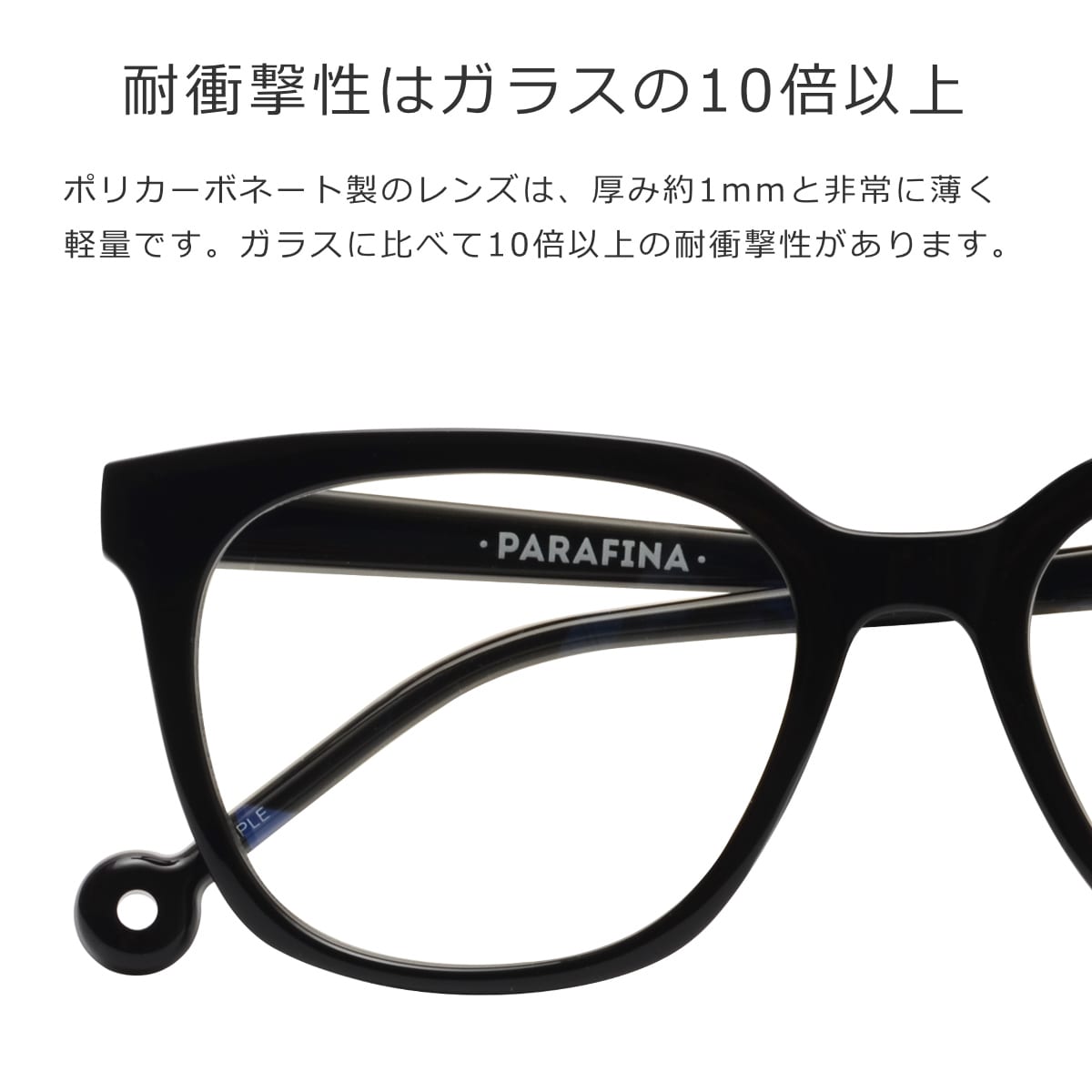 ポリカーボネート製のレンズは、厚み約1mmと非常に薄く軽量です。ガラスに比べて10倍以上の耐衝撃性があるので、安心してお使いいただけます。