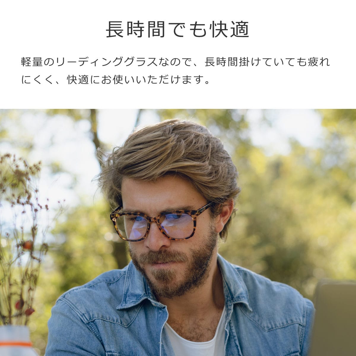 耐久性に優れた軽量のリーディンググラスなので、長時間掛けていても疲れにくく、ズレることなく快適にお使いいただけます。