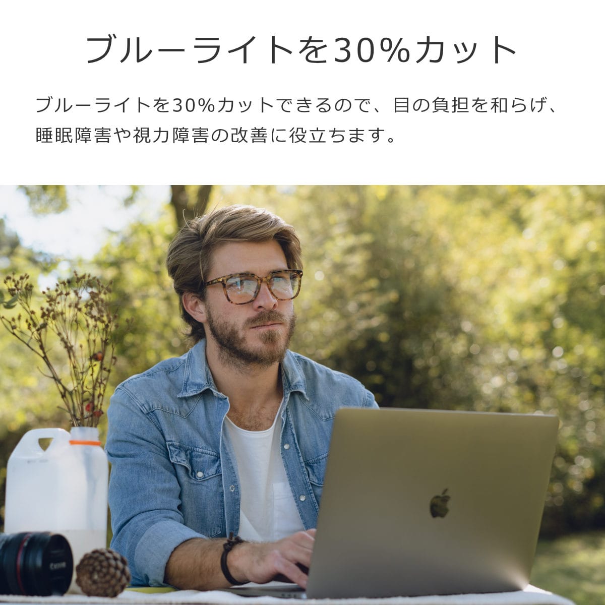 電子機器から発せられる目に有害なブルーライトを30%カットできるフィルターがかかっているので、目の負担を和らげ、睡眠障害や視力障害の改善に役立ちます。