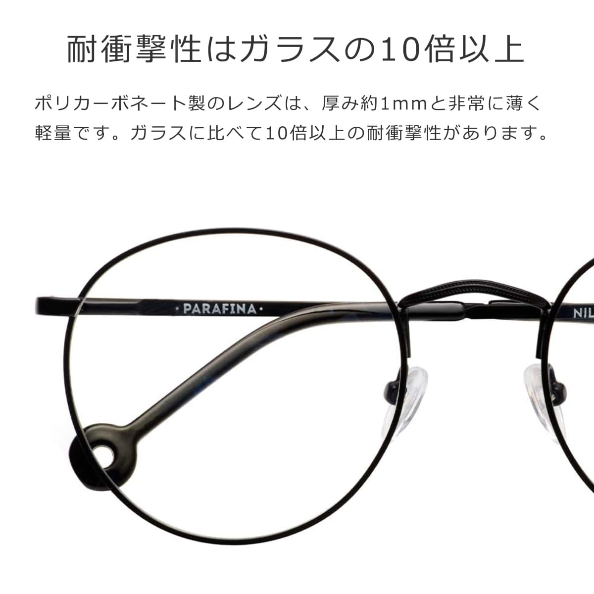 ポリカーボネート製のレンズは、厚み約1mmと非常に薄く軽量です。ガラスに比べて10倍以上の耐衝撃性があるので、安心してお使いいただけます。